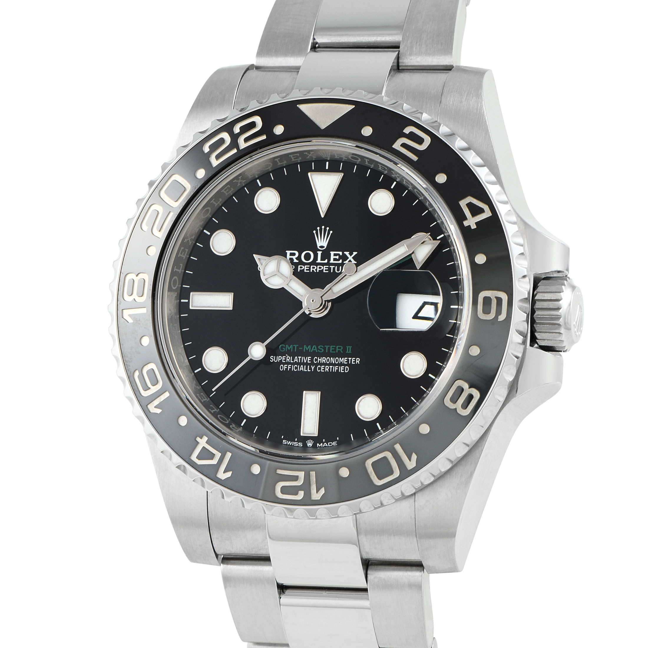This timepiece features a 40mm Oystersteel case, an Oystersteel bracelet, and a bidirectional rotatable 24-hour graduated bezel. The reimagined black dial features luminous silver toned hands, luminous index markers, a date dial located at the 3-o-clock position, and the “GMT-Master II” name in green letters. It’s powered by an automatic Rolex calibre 3285 movement with 70 hours of reserve time and is water resistant up to 100 meters.