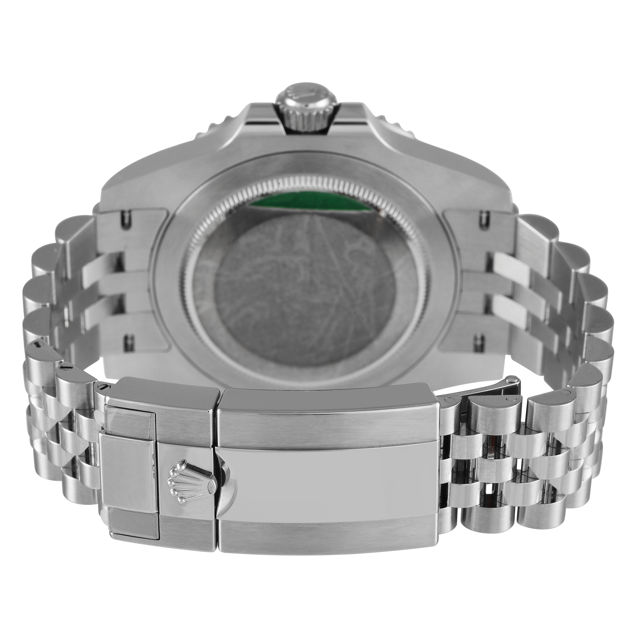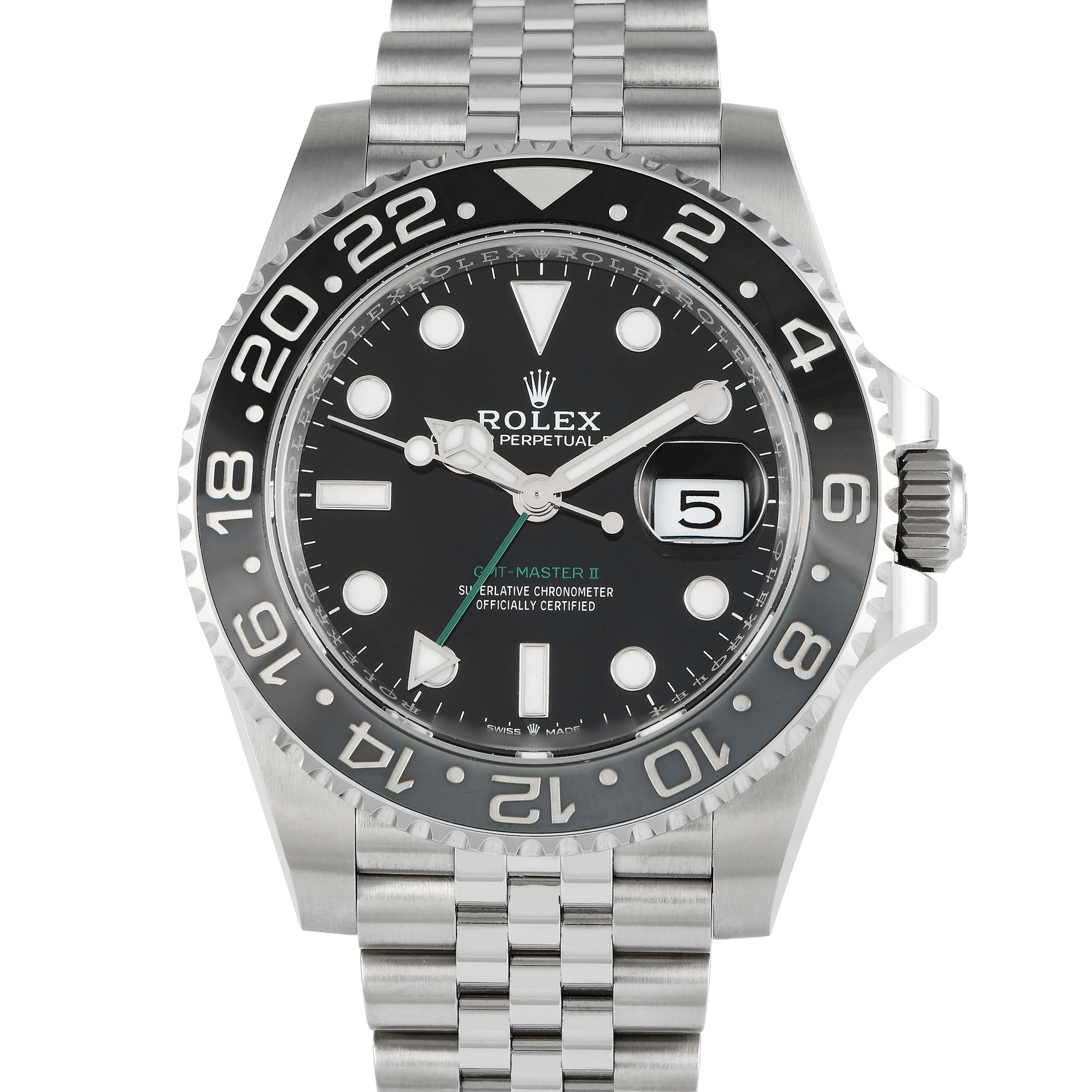 The Rolex GMT-Master II Watch, reference number 126710GRNR, features a contrasting green hand arrow-tipped hand that circles the dial once every 24 hours so travelers can easily keep track of the time in multiple parts of the world.