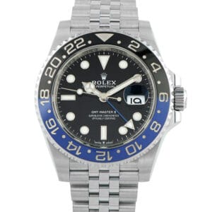 Offered pre-owned, this Rolex GMT-Master II Batgirl Oystersteel Watch 126710BLNR comes with papers and the manufacturer’s box.