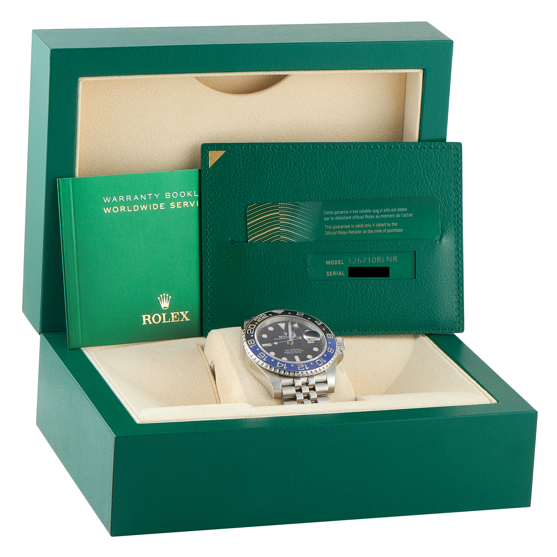 This pre-owned Rolex GMT-Master II Batman Jubilee Watch 126710BLNR includes the original manufacturer’s packaging and all associated paperwork.