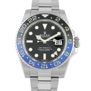 Offered pre-owned, this Rolex GMT-Master II Batman Steel Watch 116710BLNR comes complete with papers and the manufacturer’s box.