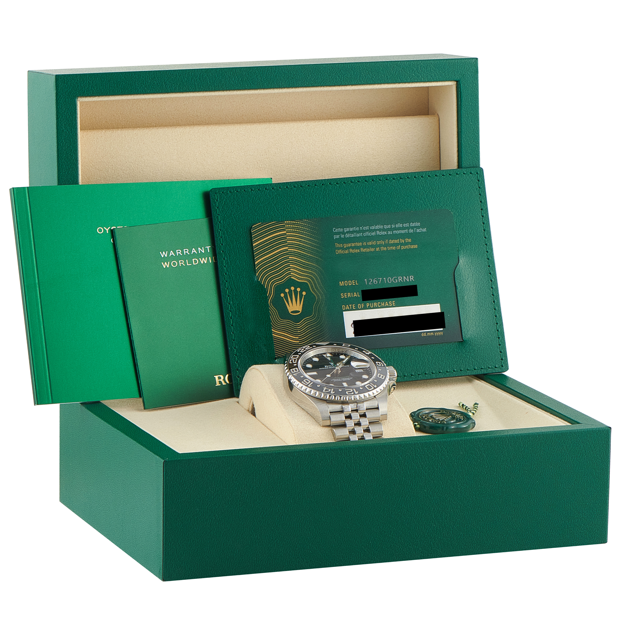Papers and the manufacturer’s box accompany this unworn Rolex GMT-Master II Bruce Wayne Watch 126710GRNR.