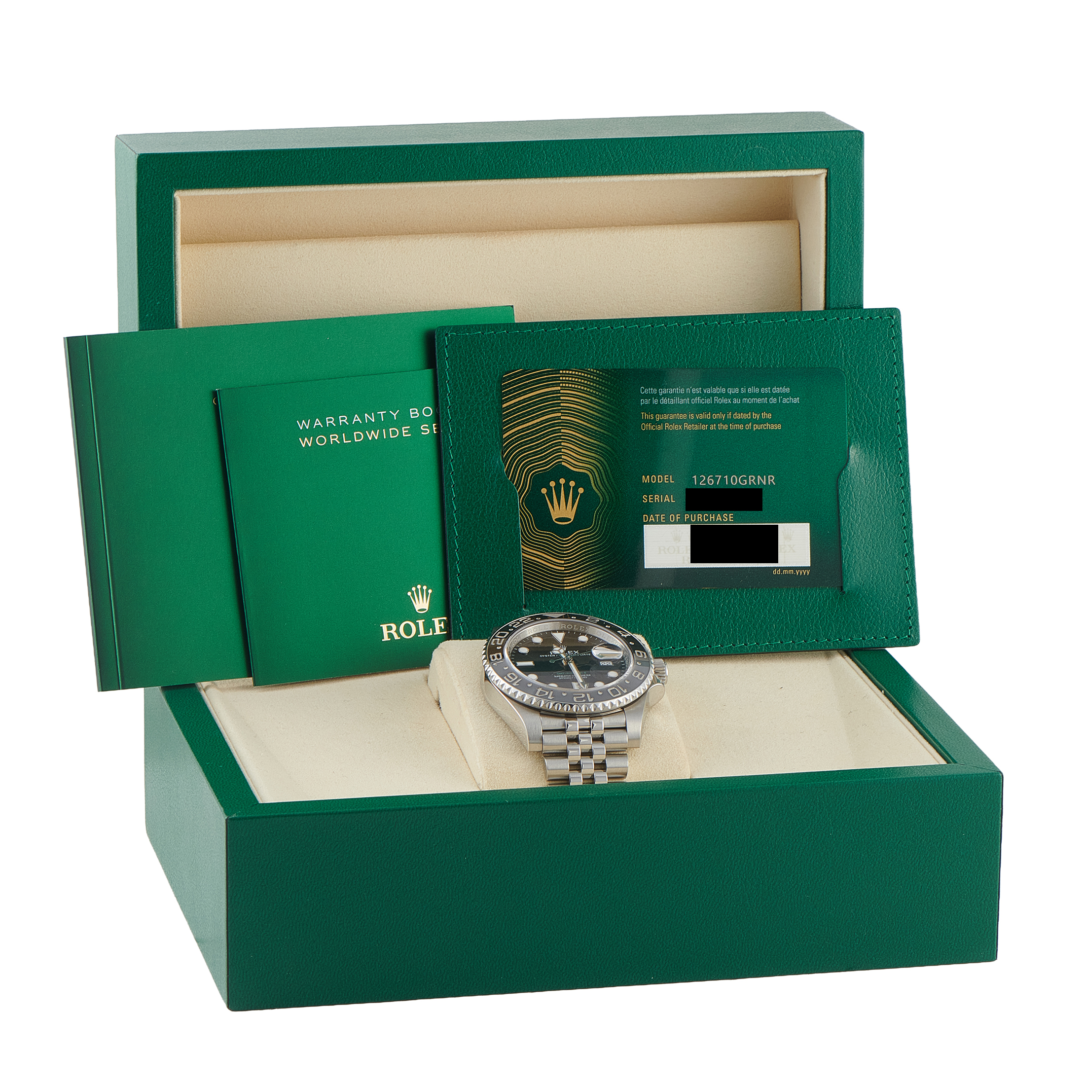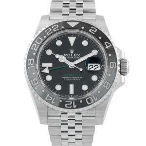 This pre-owned Rolex GMT-Master II Bruce Wayne Steel Watch 126710GRNR comes complete with papers and the manufacturer’s box.