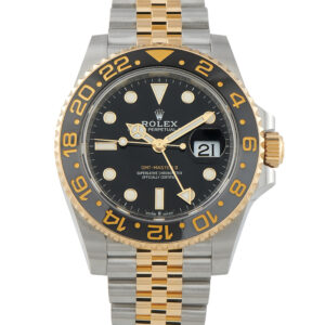 Oystersteel and yellow gold come together in the Rolex GMT-Master II ref. 126713GRNR, paired with a black and grey Cerachrom bezel that keeps the palette focused and functional. The black dial prioritizes legibility, anchored by the signature GMT hand for tracking a second time zone. Power comes from the automatic caliber 3285 movement, delivering reliable performance and a 70-hour power reserve. This reference stays close to the GMT-Master II’s original purpose, offering a practical travel watch with a refined material mix.
