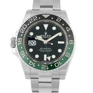 Ref. 126720VTNR was a very polarizing GMT-Master II release from Rolex in 2022. It’s just like other Rolex GMT’s except for the bezel color…and the fact that the crown and date are on the left side of the watch. This reference quickly gained the nickname “Sprite” for its black-and-green bezel insert. It is powered by the same reliable automatic 3285 movement with the same 72-hour power reserve as other current Rolex GMT-Master II models. Although secondhand Sprite prices exploded when it first came out, it now trades for similar prices as its right-hand brethren. Collectors refer to left-hand crown watches as “Destro,” while Rolex calls this watch “left-hand drive.” They carefully avoid implying that the watch “should” only be worn on the right wrist. The classic 40mm steel Oyster case of the Sprite GMT will look good no matter which side you choose to wear it on.
