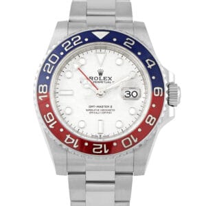 Here is one of Rolex’s most collectible modern pieces. The GMT-Master II ref. 126719BLRO stands out with its meteorite dial etched with a natural pattern that can never be replicated. The face, cut from a fragment of an ancient asteroid, is framed by the red and blue Cerachrom bezel, mounted on a 40mm case in 18K white gold. The bracelet is also in white gold, adding both weight and intrinsic value. Inside the case runs Caliber 3285, an automatic movement known for precise timekeeping and a seamless dual-time GMT function.