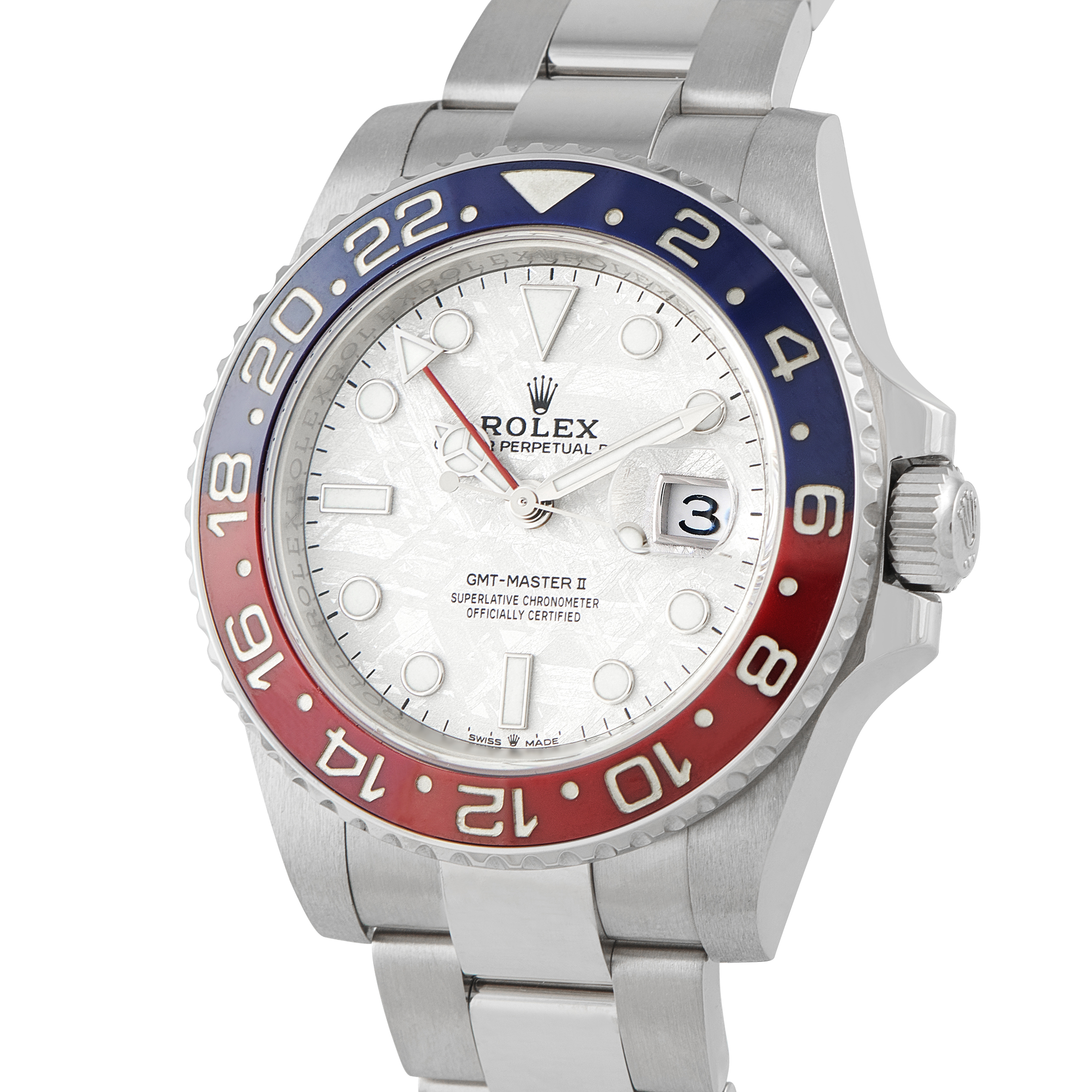This is a pre-owned Rolex GMT-Master II Meteorite Dial 18K White Gold Watch 126719BLRO. It comes complete with papers and the manufacturer’s box.