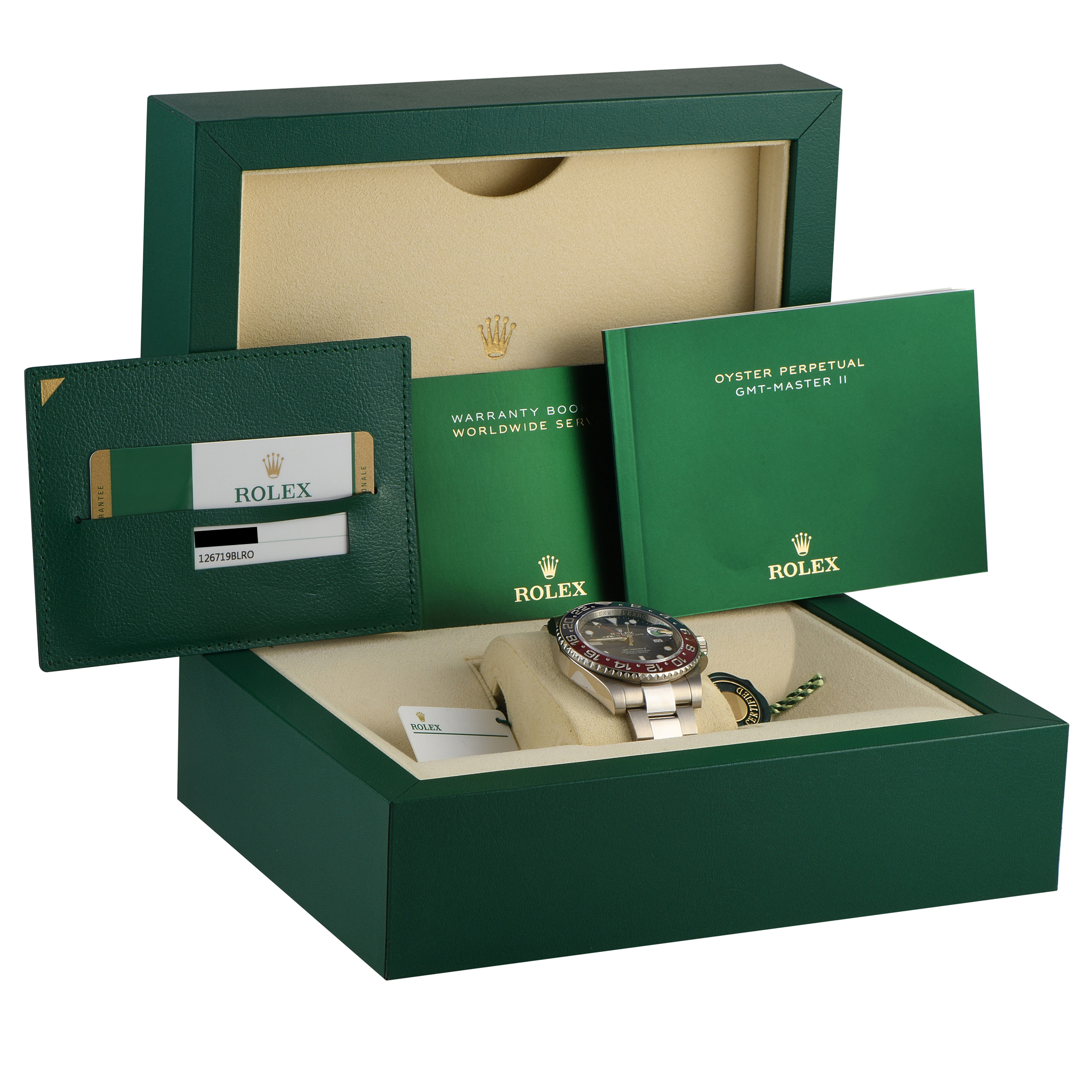 This is a pre-owned Rolex GMT-Master II Midnight Blue Dial 18K White Gold Watch 126719BLRO. It is accompanied by papers and the manufacturer’s box.