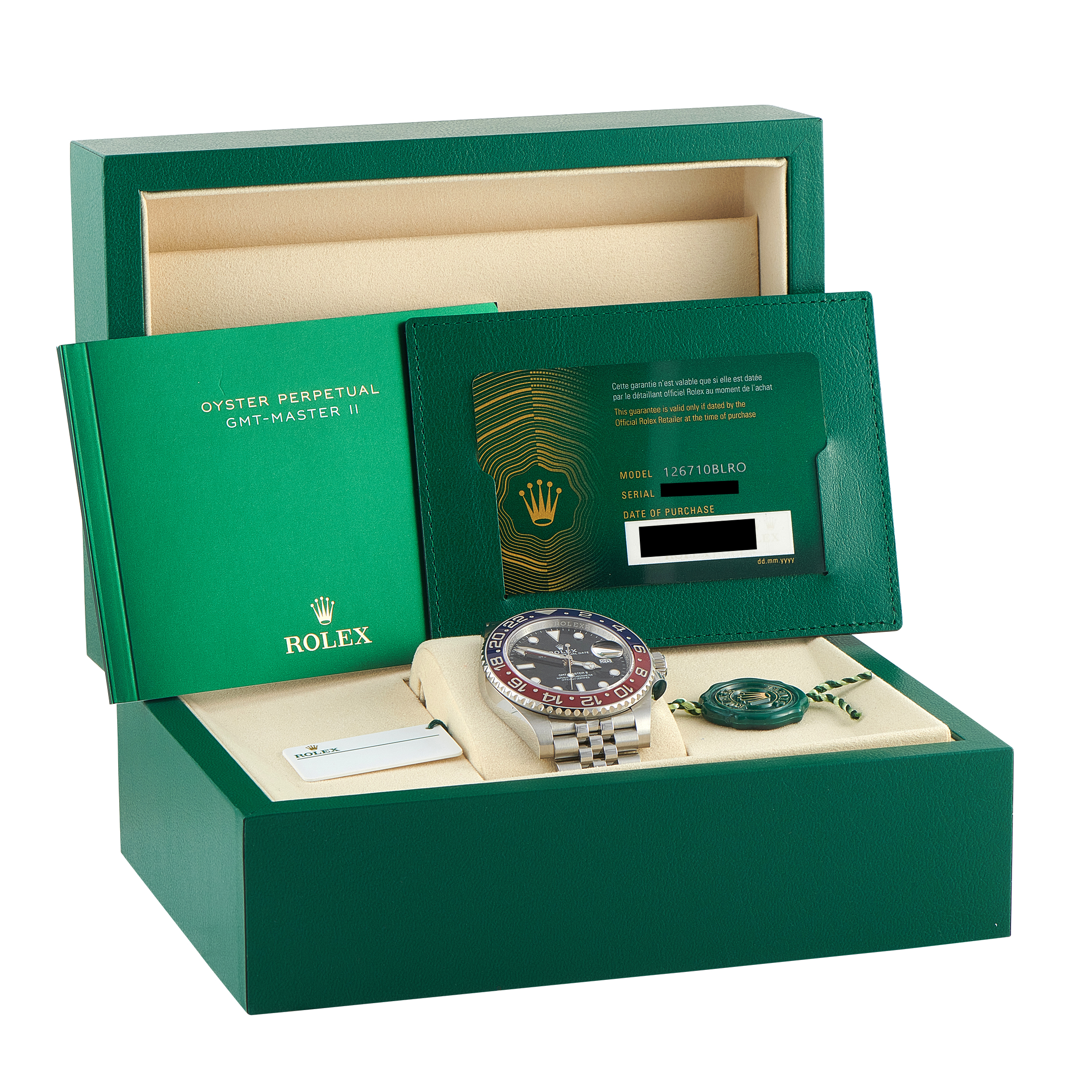 This is a unworn Rolex GMT-Master II Pepsi Steel Watch 126710BLRO, accompanied by the manufacturer’s box and papers.