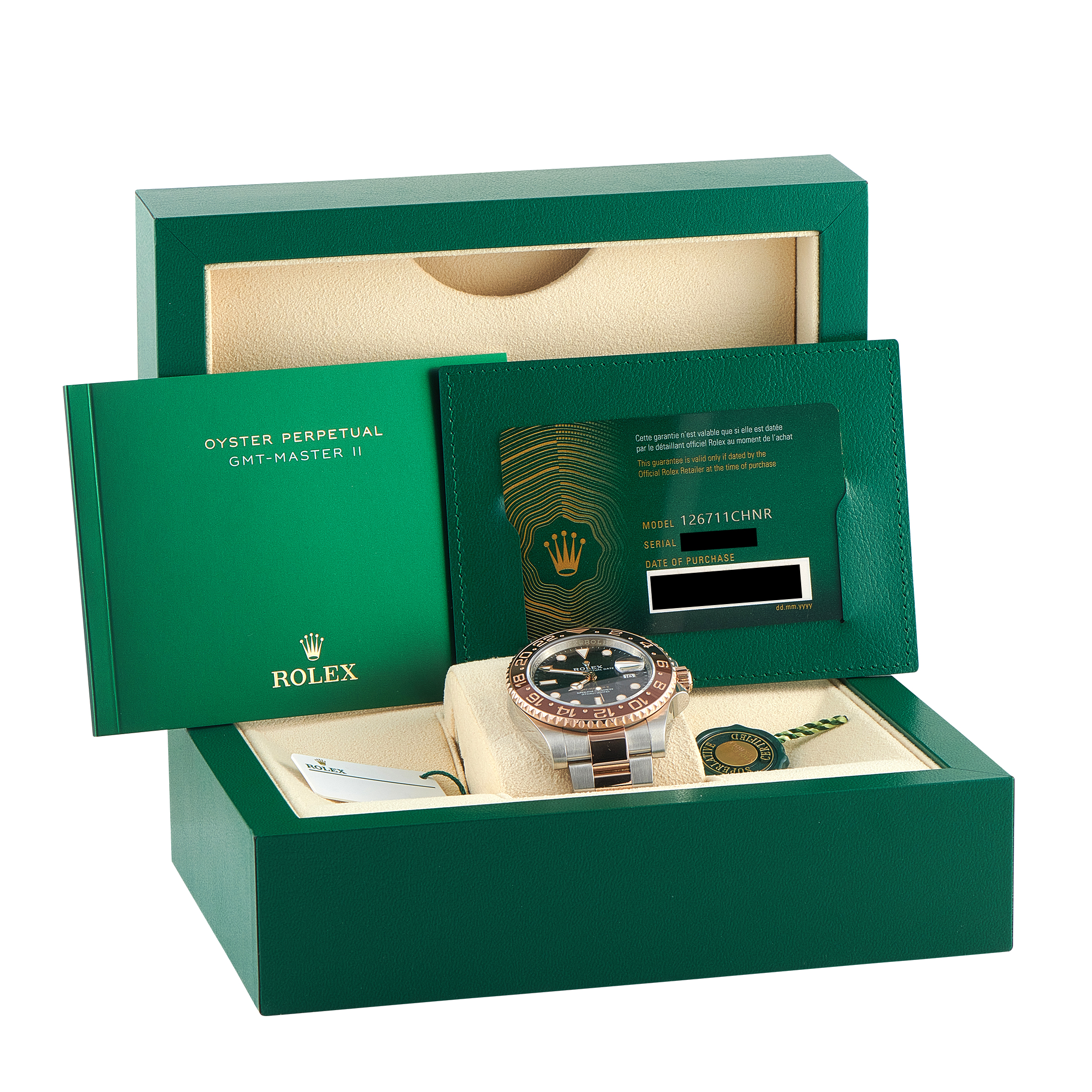 This is a pre-owned Rolex GMT-Master II Everose Rolesor Watch 126711CHNR, accompanied by papers and the manufacturer’s box.