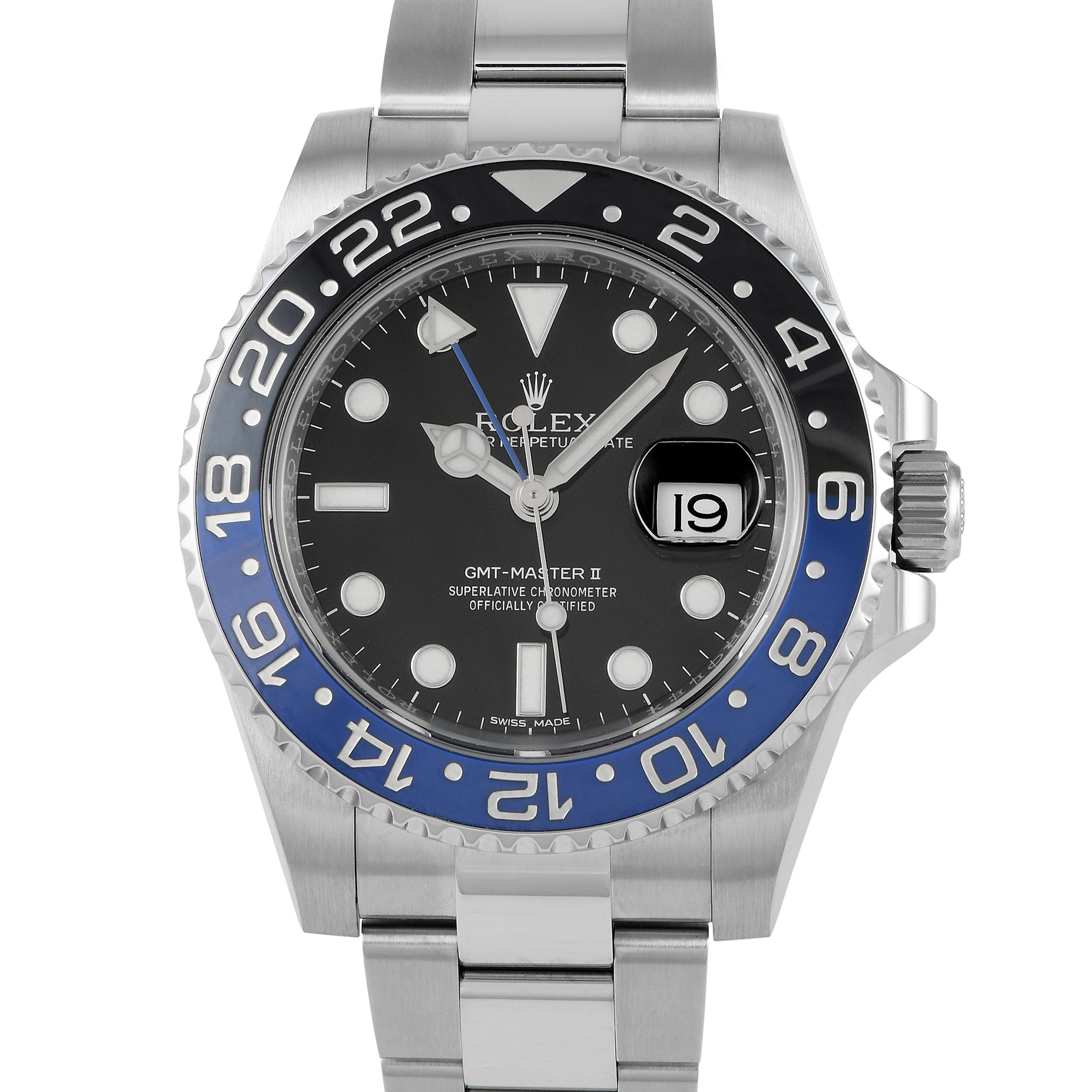 The Rolex GMT-Master II ref. 116710BLNR, better known as the “Batman,” debuted in 2013. The watch has a 40mm steel Oyster case, a Triplock crown, an Oyster bracelet with polished center links. This was the first Rolex reference with a blue-and-black bezel insert, and it was only available on an Oyster bracelet. The reliable caliber 3186 self-winding movement features a Parachrom hairspring, 48 hours of power reserve, and a quieter rotor than newer Rolexes.