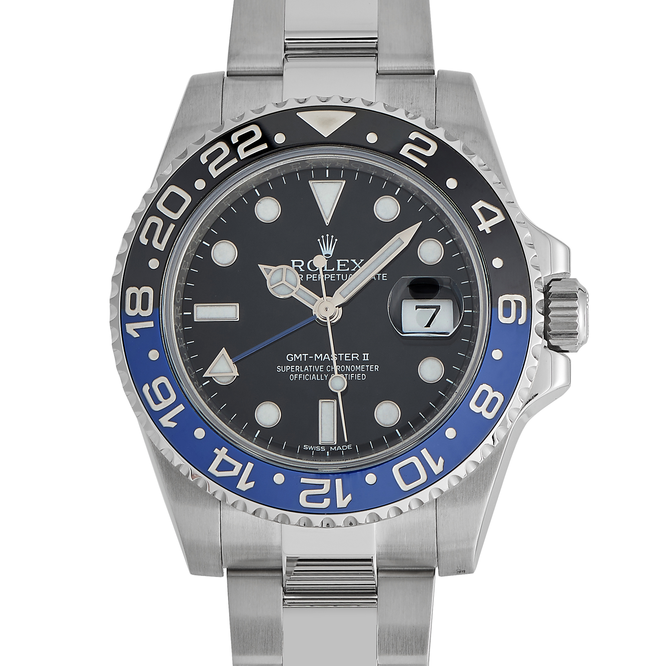 The Rolex GMT-Master II ref. 116710BLNR, better known as the “Batman,” debuted in 2013. The watch has a 40mm steel Oyster case, a Triplock crown, an Oyster bracelet with polished center links. This was the first Rolex reference with a blue-and-black bezel insert, and it was only available on an Oyster bracelet. The reliable caliber 3186 self-winding movement features a Parachrom hairspring, 48 hours of power reserve, and a quieter rotor than newer Rolexes.