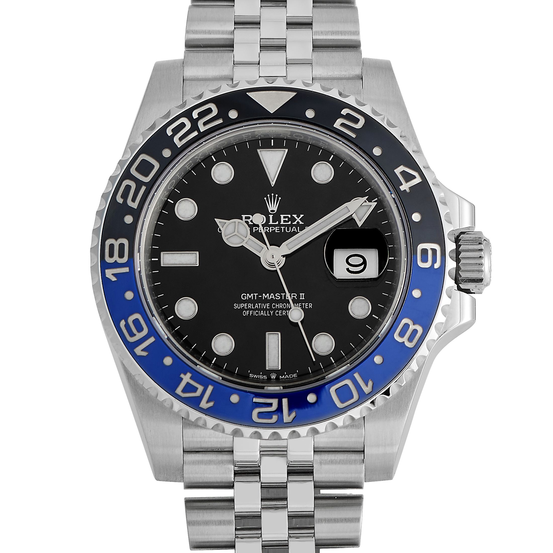 The Rolex GMT-Master II ref. 126710BLNR, better known as the “Batman,” debuted in 2019, replacing the original 116710BLNR. The watch has a 40mm steel Oyster case, a Triplock crown, an Oyster bracelet with polished center links, and a distinctive blue-and-black bezel insert. The caliber 3285 self-winding movement offers a Chronergy escapement, Parachrom hairspring, and 72 hours of power reserve.