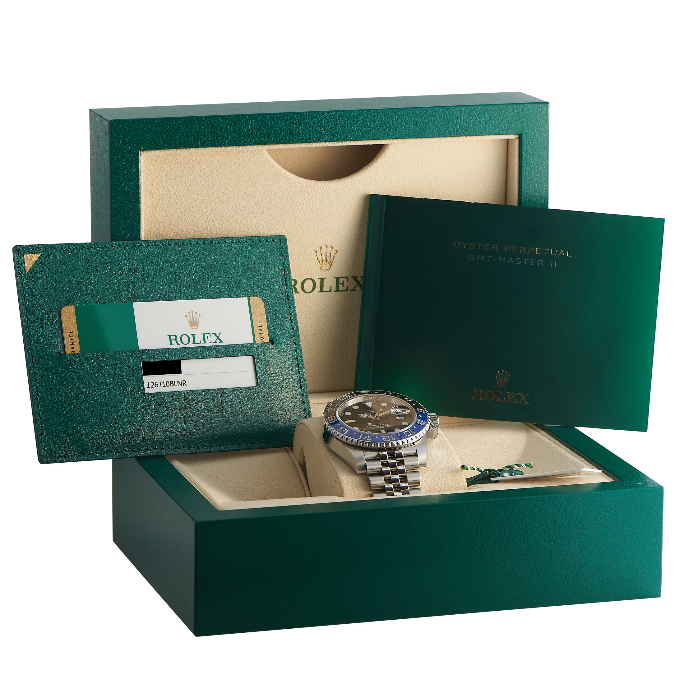 Papers and the manufacturer’s box accompany this pre-owned Rolex GMT-Master II Jubilee Watch 126710BLNR.