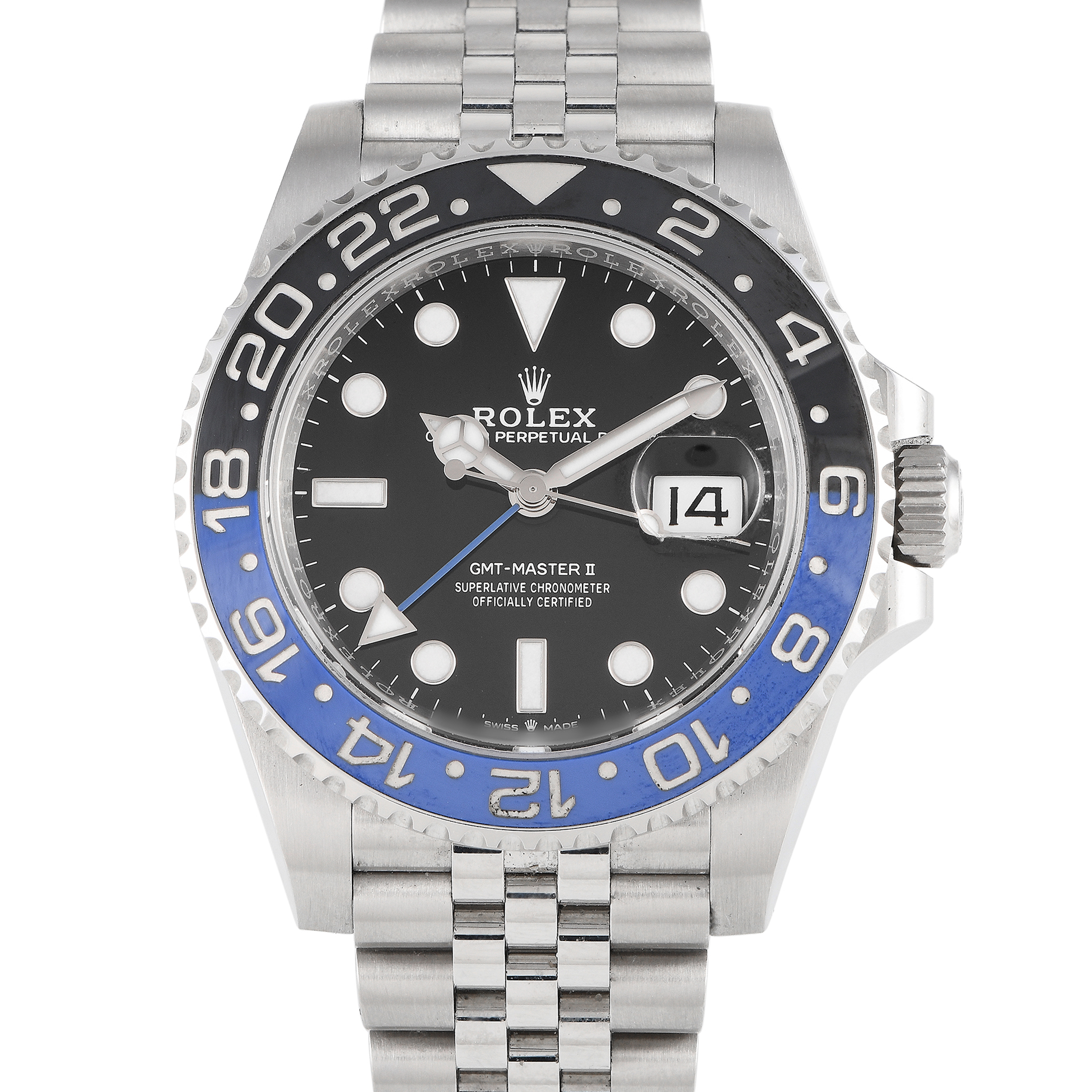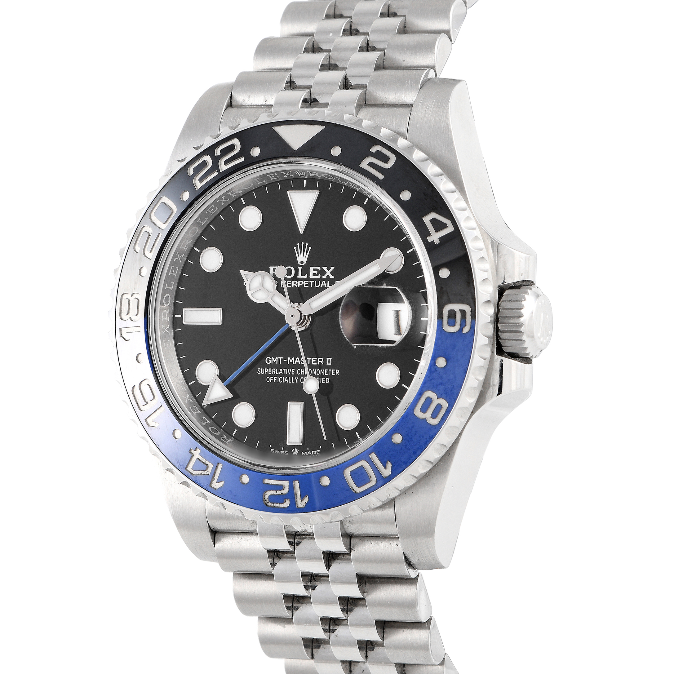 This pre-owned Rolex GMT-Master II Batman Oystersteel Jubilee Watch 126710BLNR comes with papers and the manufacturer’s box.