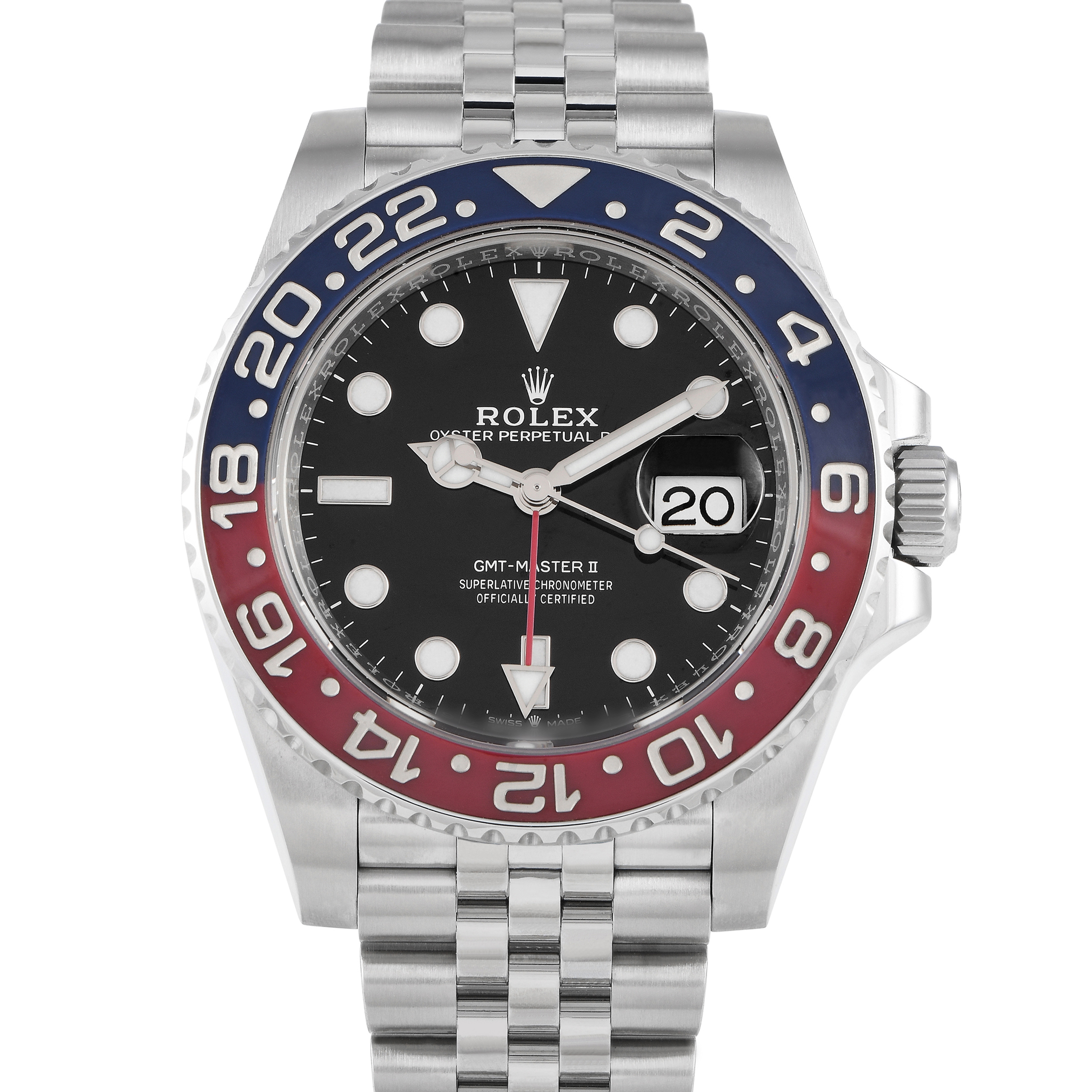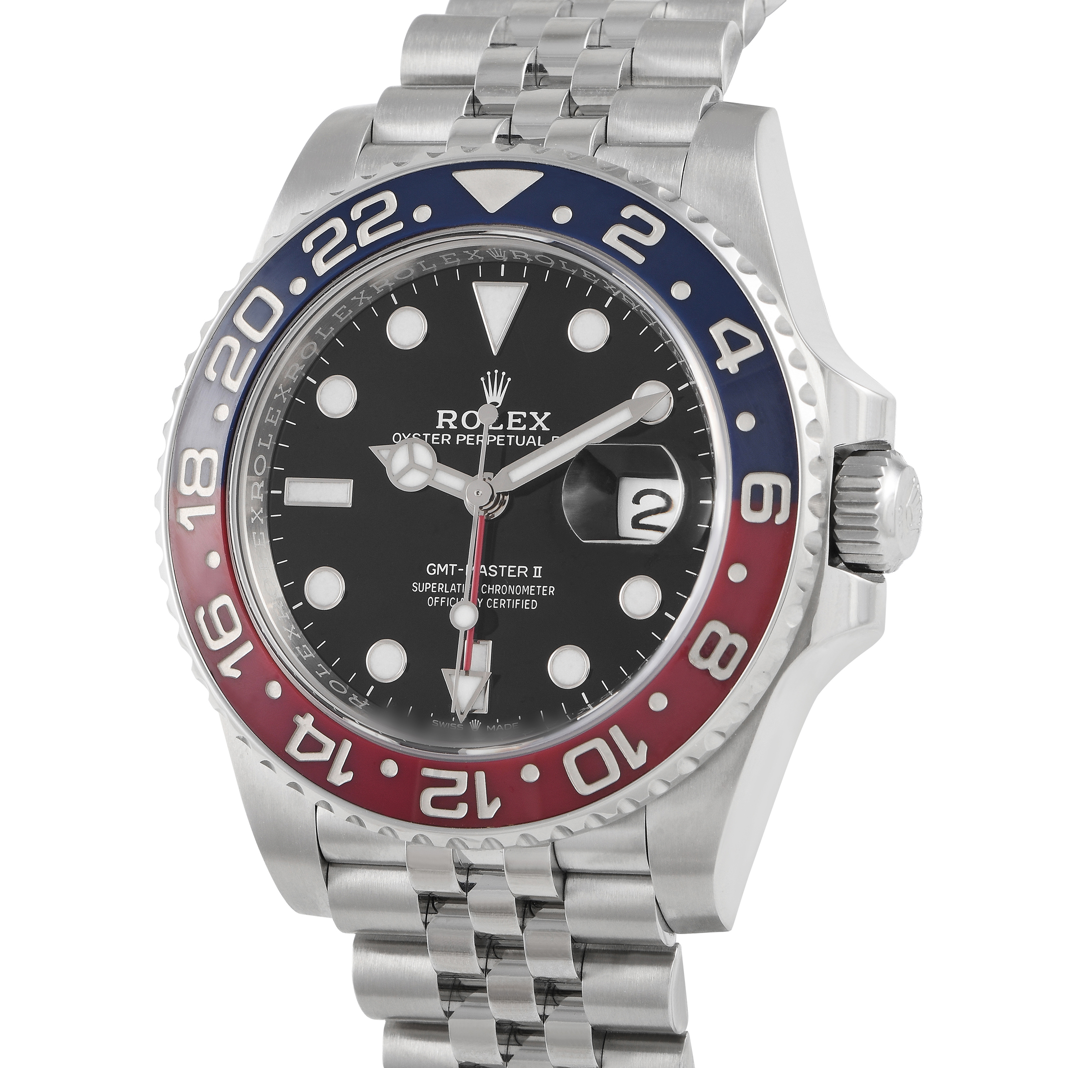 Offered in pre-owned condition, this Rolex GMT-Master II Pepsi Oystersteel Watch 126710BLRO comes with papers and the manufacturer’s box.