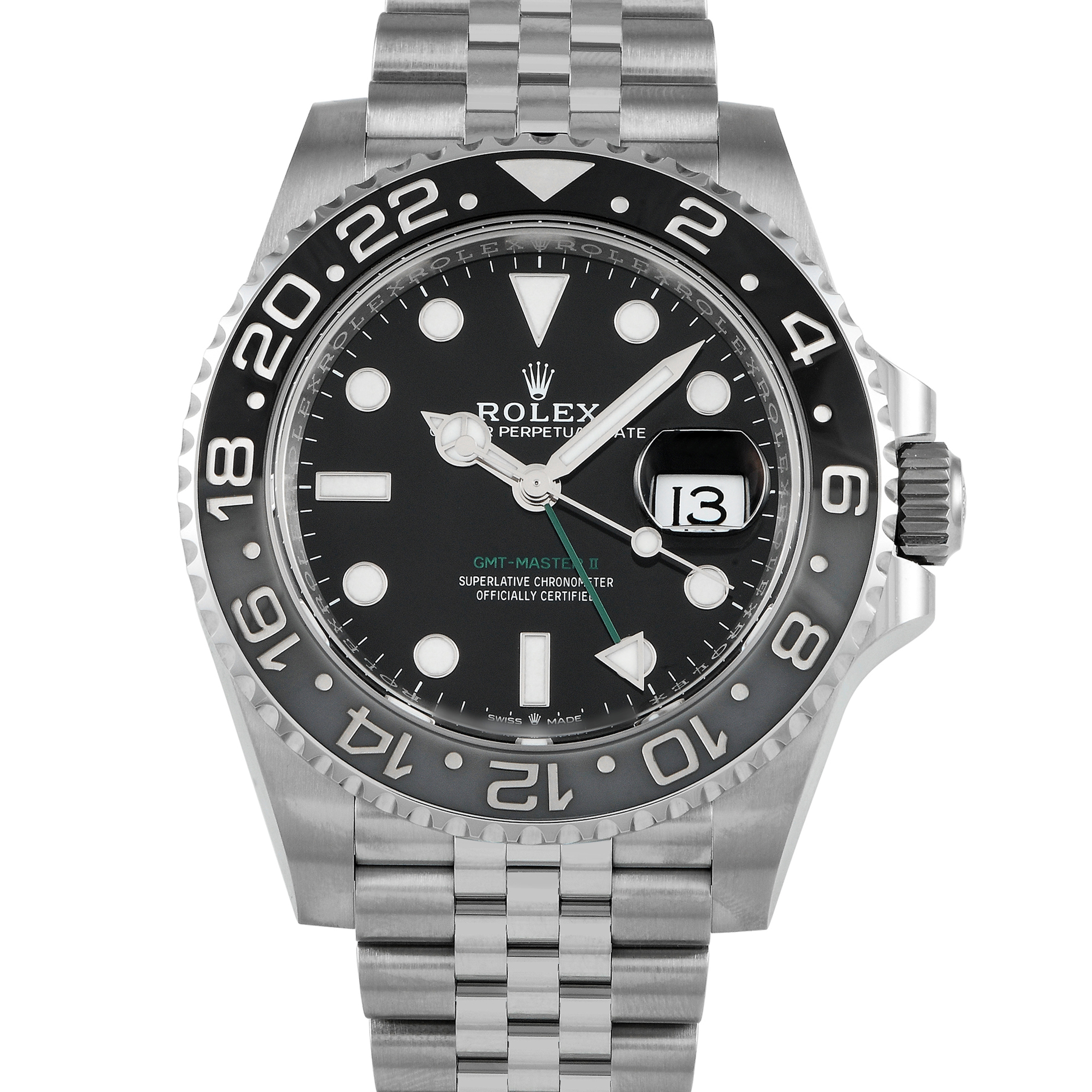 Modern, masculine, and monochromatic, the Rolex GMT-Master II ref.126710GRNR with a bi-colored gray-black ceramic bezel is perfect for those who prefer their timekeeping instrument to have a versatile and streamlined aesthetic. The watch’s Oystersteel case measures 40mm in diameter and is fitted with a comfortable Jubilee bracelet. Beneath the caseback is the Rolex in-house automatic caliber 3285 self-winding movement with 70 hours of power reserve. On the glossy black dial are Chromalight-filled hour markers in simple shapes, luminous hour and minute hands, an arrow-tipped GMT hand, and a date window at 3 o’clock.