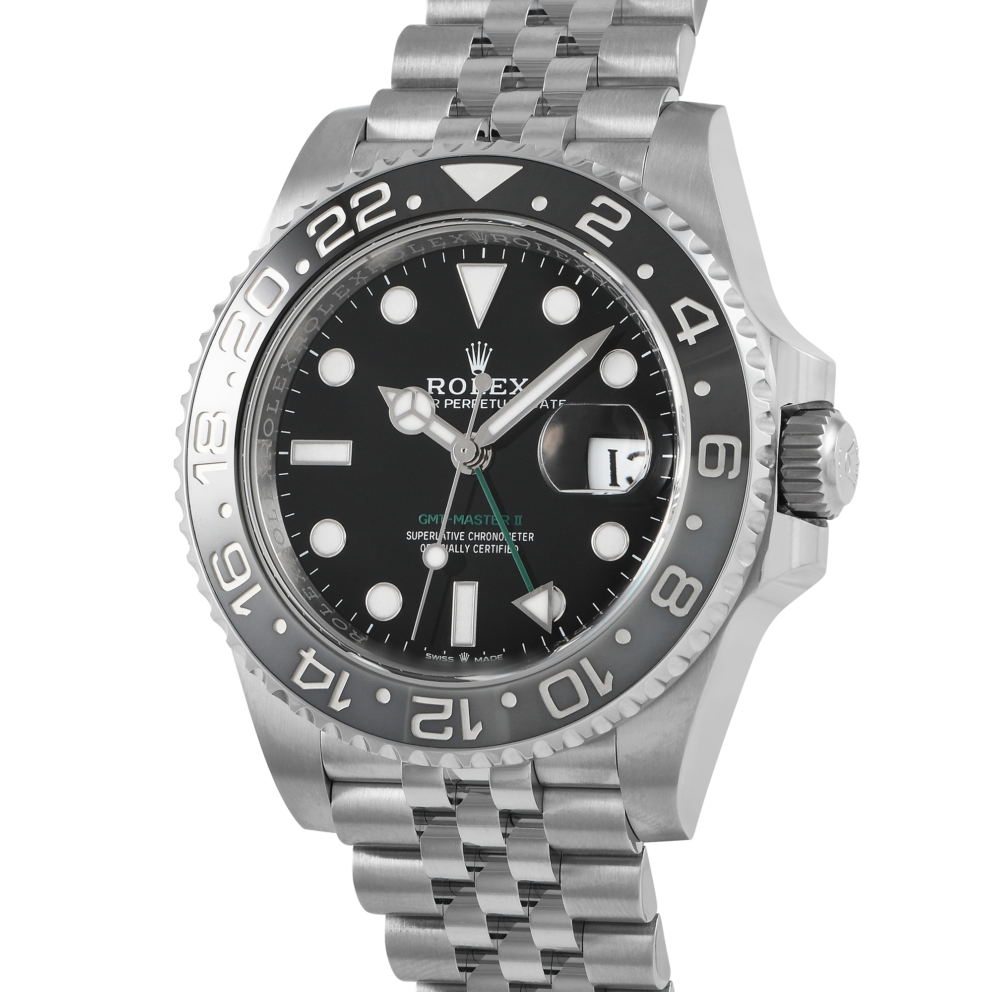 Papers and the manufacturer’s box accompany this unworn Rolex GMT-Master II Bruce Wayne Watch 126710GRNR.