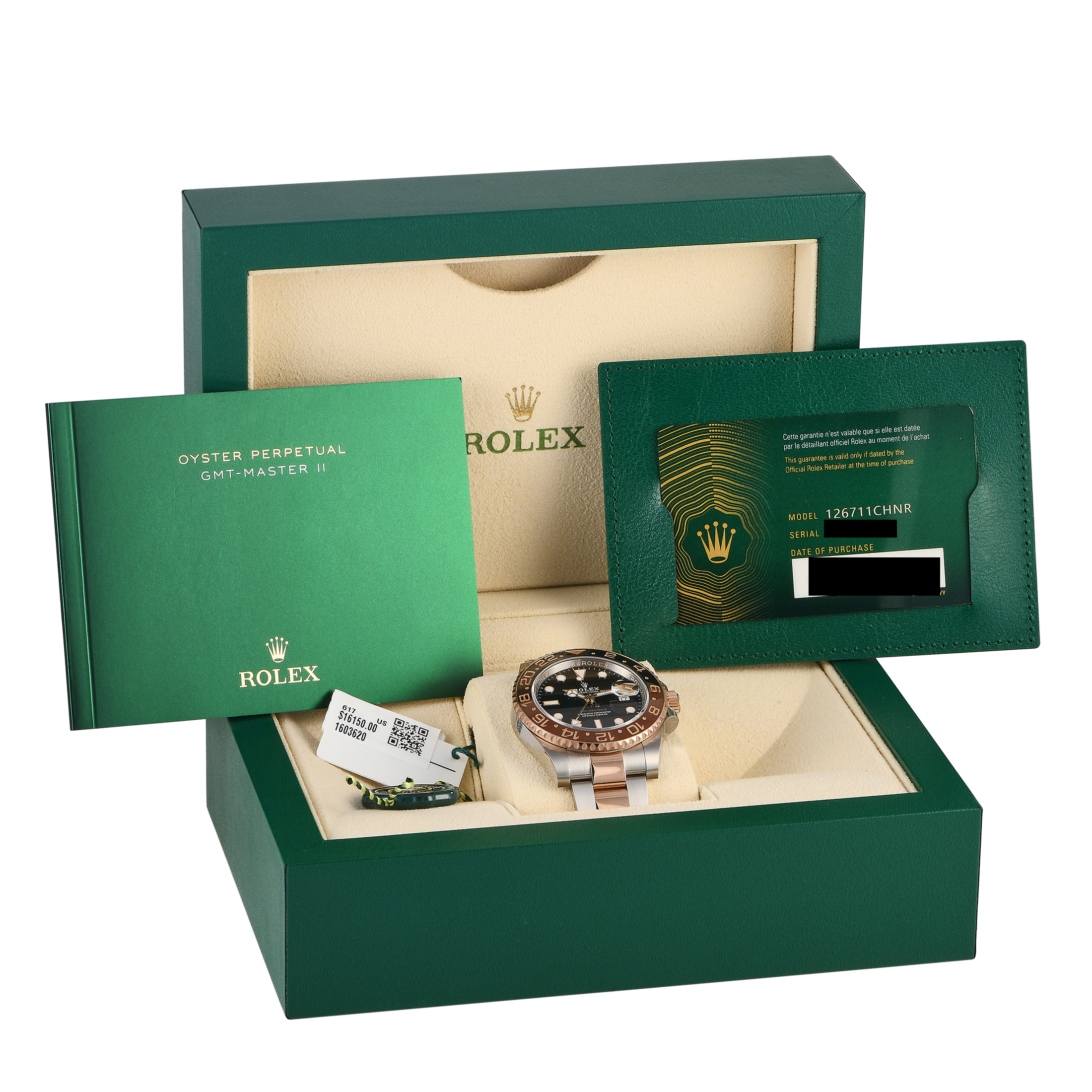 This pre-owned Rolex GMT-Master II Rootbeer Steel and 18K Everose Gold Watch 126711CHNR is accompanied by papers and the manufacturer’s box.