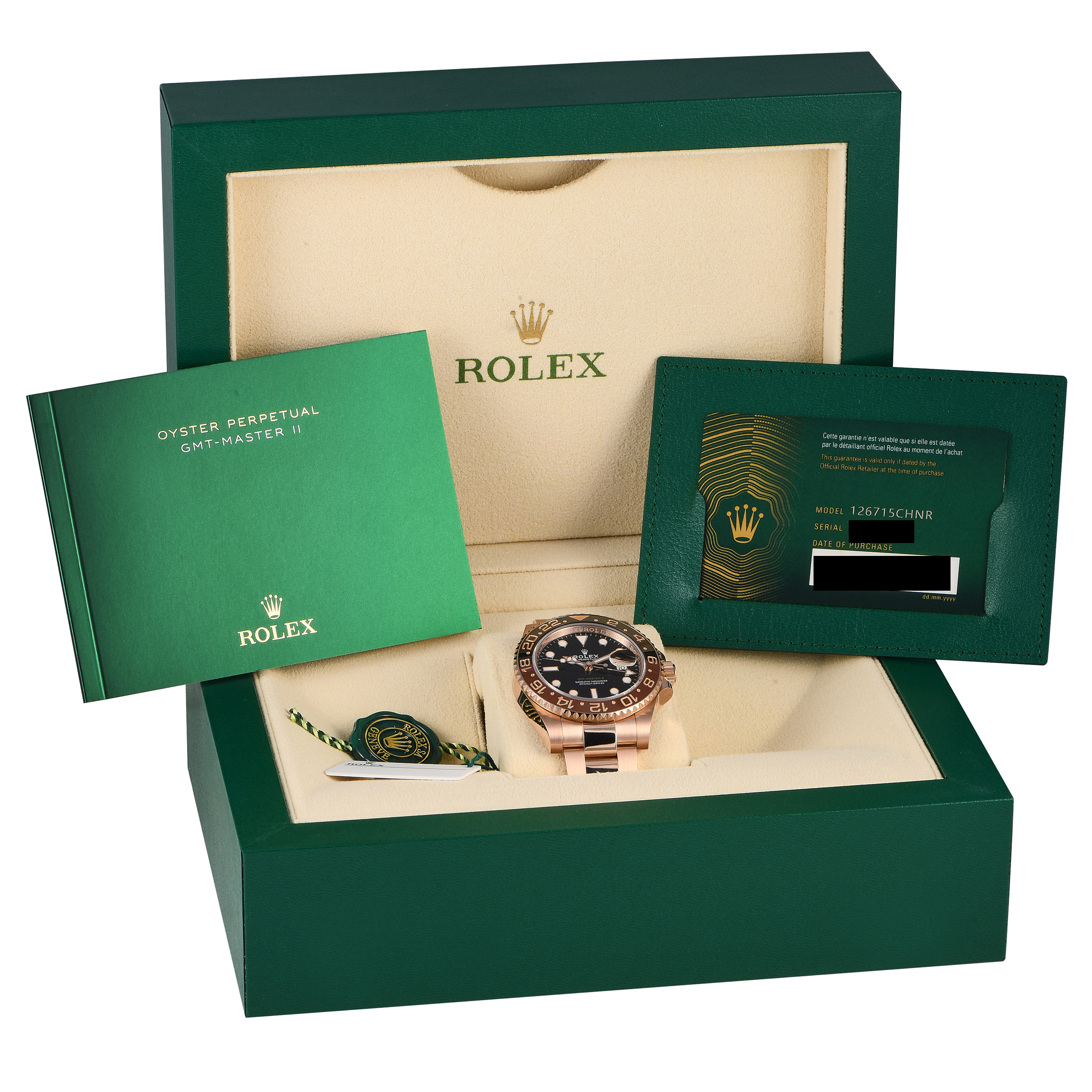This pre-owned Rolex GMT-Master II Root Beer 18K Everose Gold Watch 126715CHNR comes with papers and the manufacturer’s box.