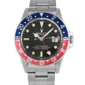 This pre-owned Rolex GMT-Master Pepsi Matte Black Watch 16750 comes with papers and a gift box.
