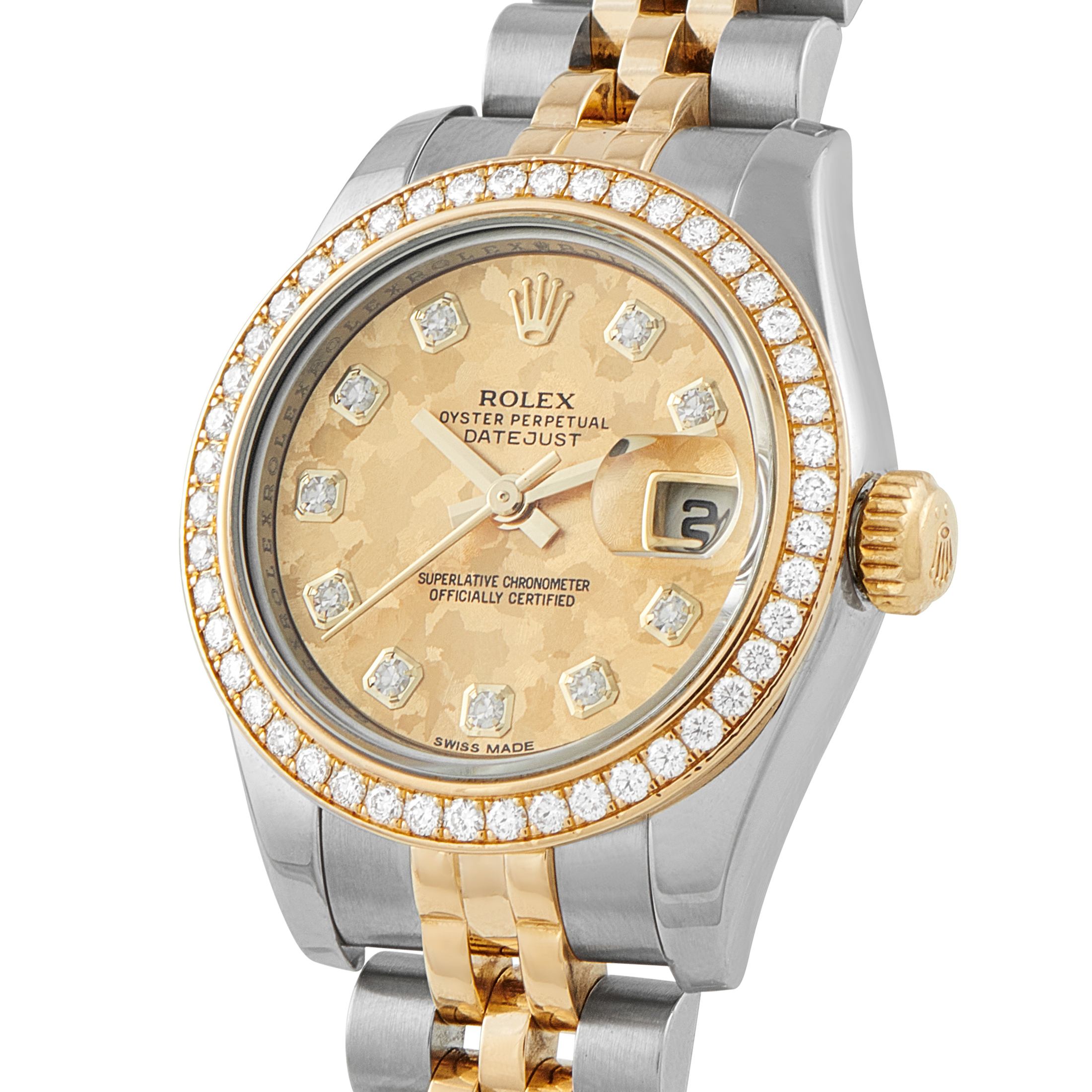 The Lady-Datejust for those who want something genuinely their own. On this Rolex ref. 179383 is a solid gold dial that cannot be duplicated. It features a “flake-like” crystallization pattern that emerges naturally during the treatment of the 18k gold alloy, revealing faceted surfaces that catch light at varying angles. Diamonds at each hour intensify this effect.