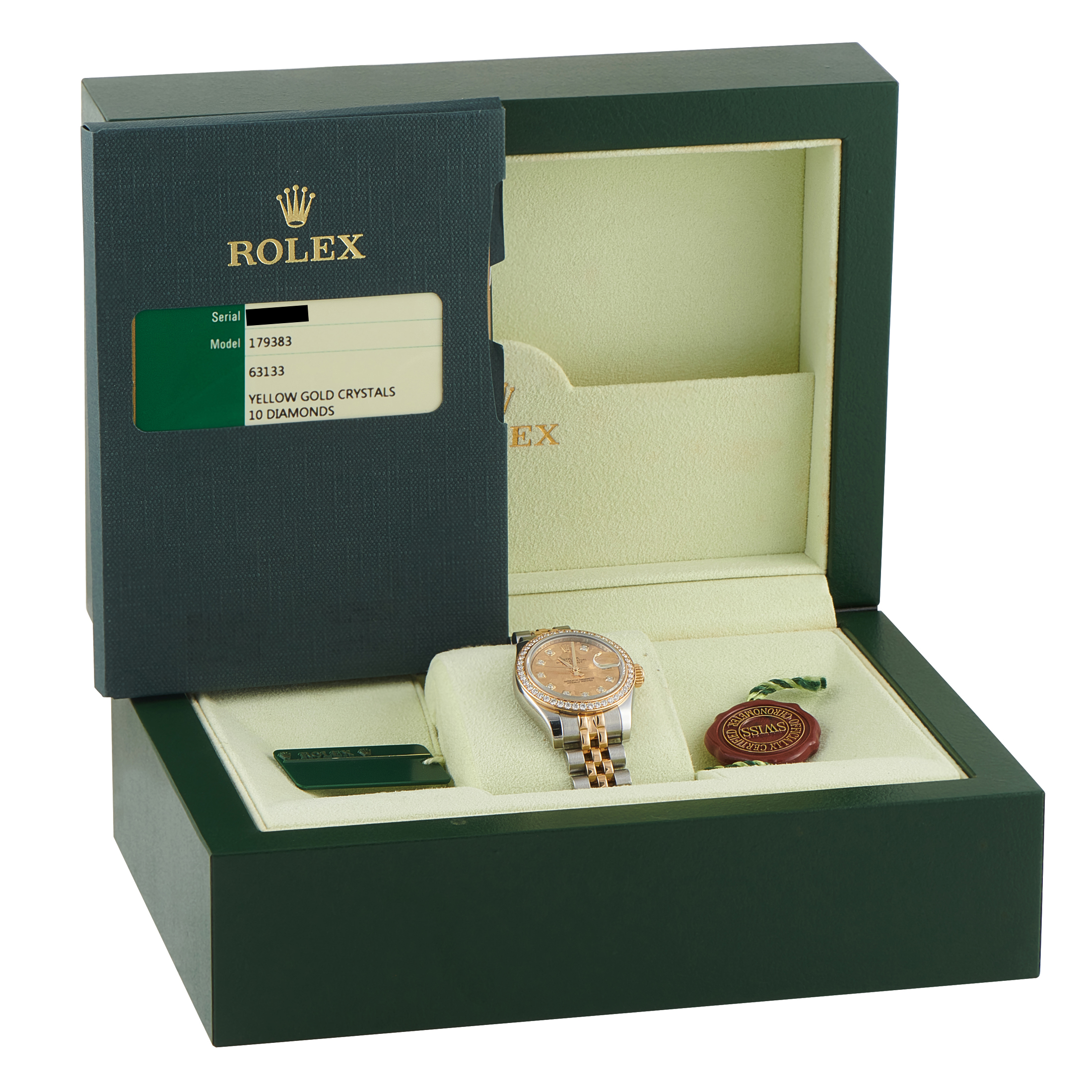 This is a pre-owned Rolex Lady-Datejust Gold Crystal Diamond Dial Yellow Rolesor Jubilee Watch 179383. It is accompanied by papers and the manufacturer’s box.