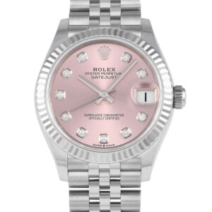 A mid-size Datejust designed with feminine refinement. This model features a 31mm Oystersteel case with an 18K white gold fluted bezel and an Oystersteel Jubilee bracelet. It has an alluring sunray-finished pink dial with diamond hour markers, each in an 18K white gold setting. The beating heart of this watch is caliber 2236, a self-winding movement with approximately 55 hours of power reserve.