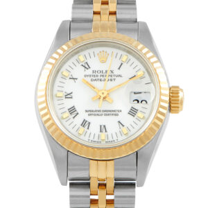With a charming two-tone aesthetic, the Lady Datejust 69173 is an excellent choice for women who seek a refined, versatile Rolex. Its solid steel and 18K yellow gold construction ensures longevity, making it a great heirloom piece. The watch features a classic white dial with gold hands, a 3 o’clock date window, and black painted Roman numerals—each with a corresponding applied gold hour marker. It is worn on a Jubilee bracelet that offers comfort and a vintage appeal.