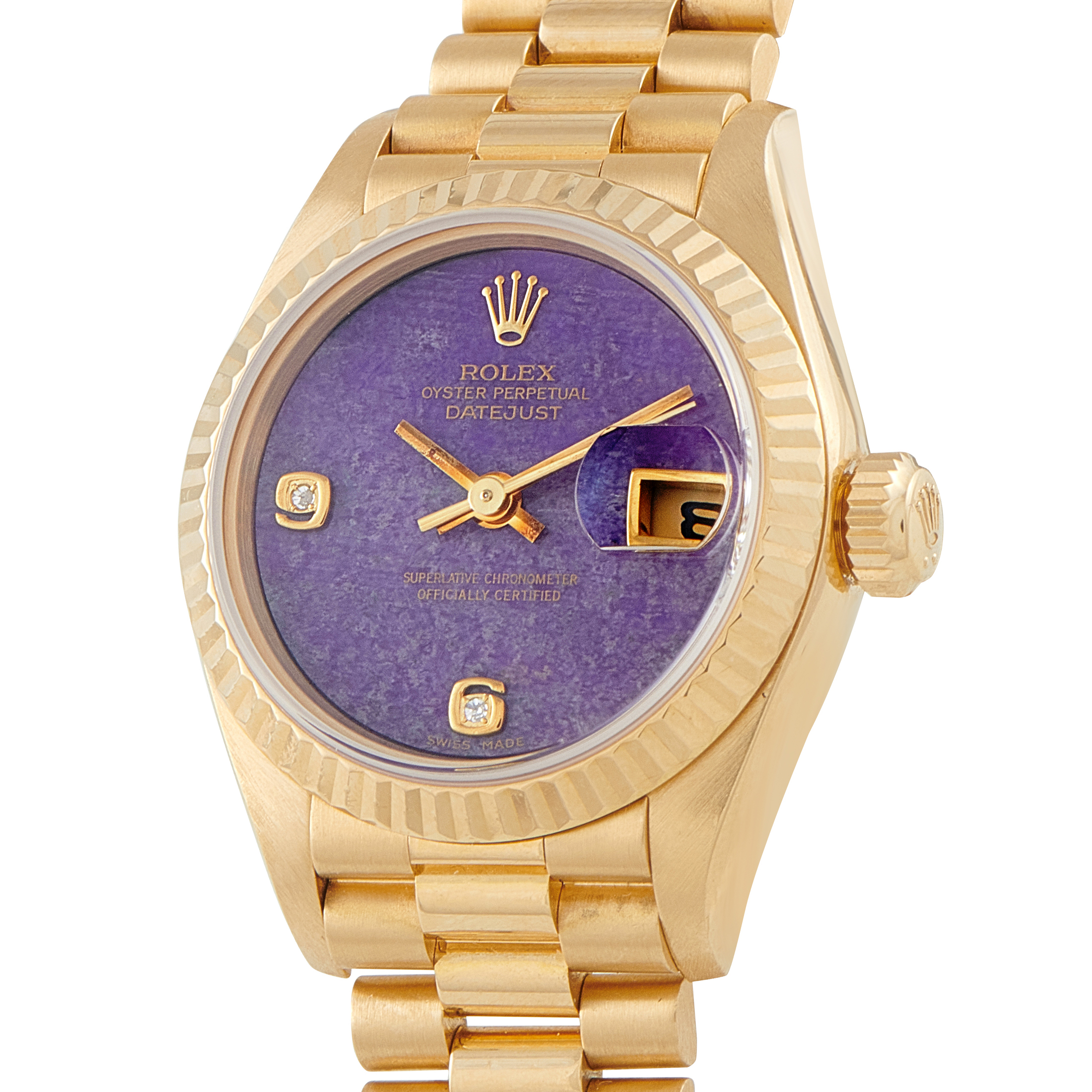 Exceptionally elusive and keenly sought after, this full yellow gold Rolex Lady-Datejust 69178 with sky lavender sugilite dial represents a seldom-seen configuration from the vintage era. Hardstone production was limited, and examples today are only occasionally encountered.