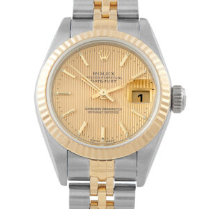 With texture, contrast, and precious metal, this ref. 79173 carries the full Datejust vocabulary. This 26mm format, refined for smaller wrists, is finished with a champagne tapestry dial. Vertical engraved lines create a woven effect across its face, with gold hands and applied markers that merge seamlessly with the warm backdrop. The fluted bezel frames the dial in sharp relief, while the Jubilee bracelet adds articulation on the wrist. Operational duty is handled by the Calibre 2235, a self-winding movement recognized for its reliability. Power reserve is 48 hours.