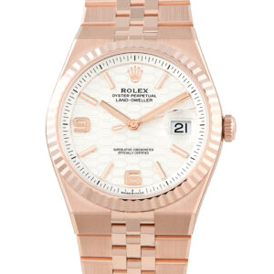 The Everose gold Land-Dweller 36 ref. 127235 represents a new chapter in Rolex’s pursuit of technical and aesthetic excellence. Crafted entirely in the brand’s proprietary 18K Everose gold, the 36mm case, fluted bezel, and Flat Jubilee bracelet demonstrate refinement. The intense white honeycomb dial adds depth, while the Chromalight on the index and Arabic numerals and hands ensures legibility. Driving the watch is the newly developed Caliber 7135, equipped with the Dynapulse escapement. This groundbreaking yet simple mechanism enhances efficiency, precision, and reliability. The watch is water-resistant to 100 meters and has a 66-hour power reserve.