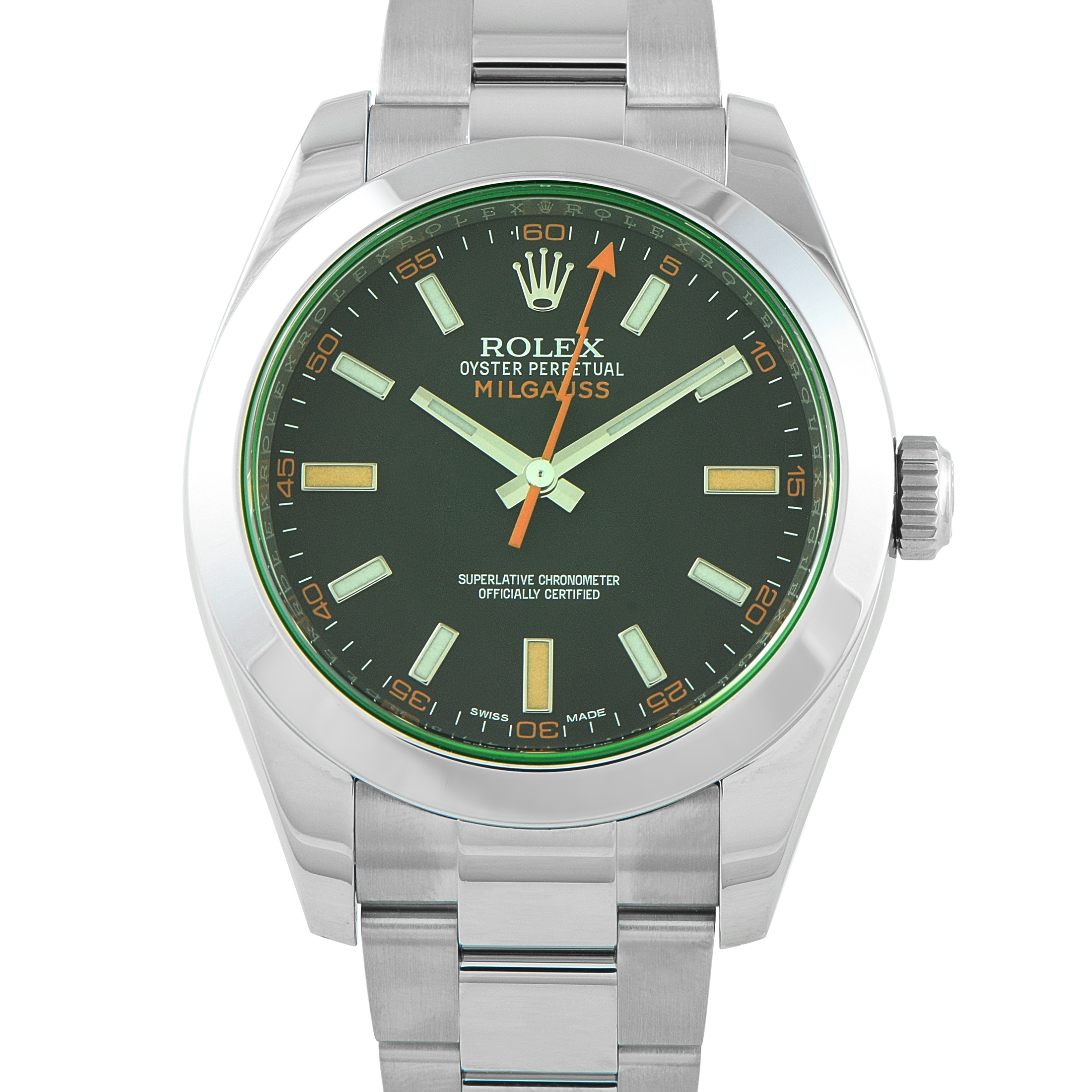 A Rolex model with a rare mix of purpose and personality. The Milgauss ref. 116400GV features a distinctive design with its exclusive green sapphire crystal that casts a subtle halo around the dial. An orange lightning bolt seconds hand gives the black dial its bold identity. Within the 40mm Oystersteel case is the anti-magnetic caliber 3131 automatic mechanical movement with a 48-hour reserve.