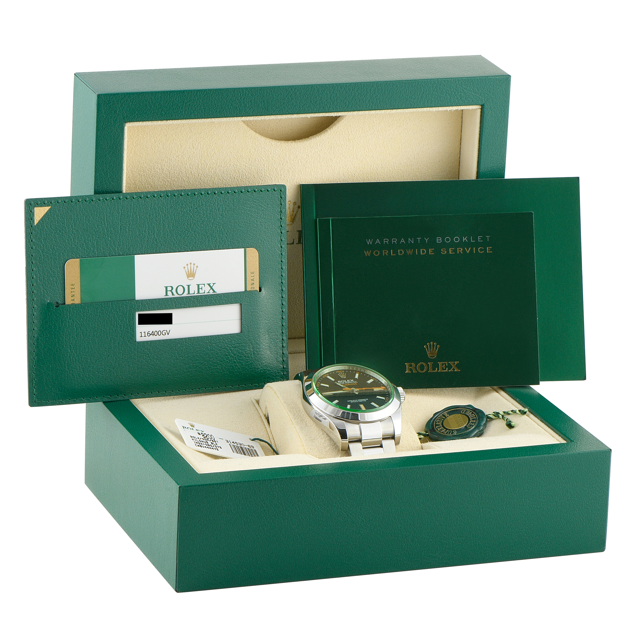 This pre-owned Rolex Milgauss Black Dial Steel Watch 116400GV is accompanied by papers and the manufacturer’s box.