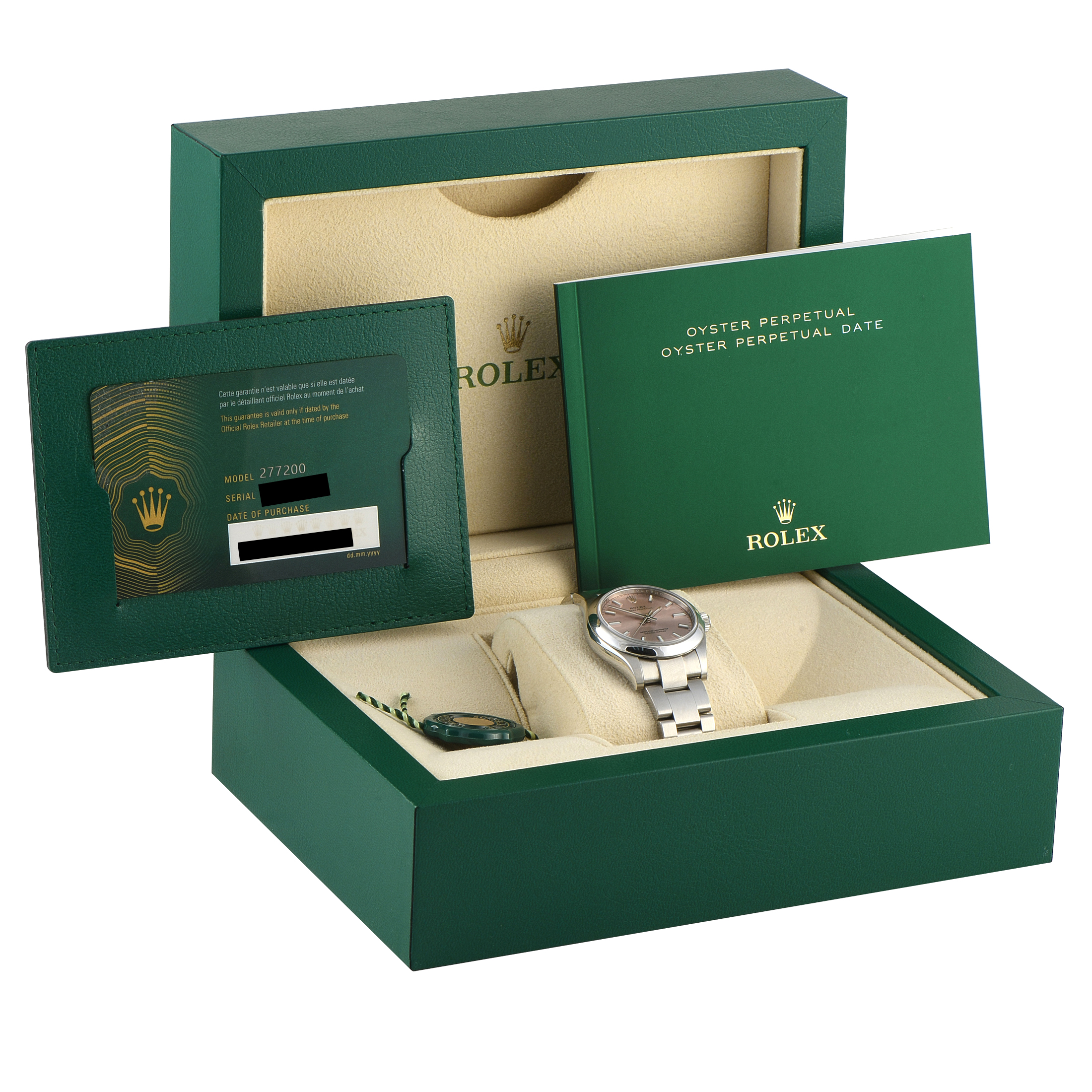 This Rolex Oyster Perpetual Pink Dial Steel Ladies Watch 277200 comes with papers and the manufacturer’s box.