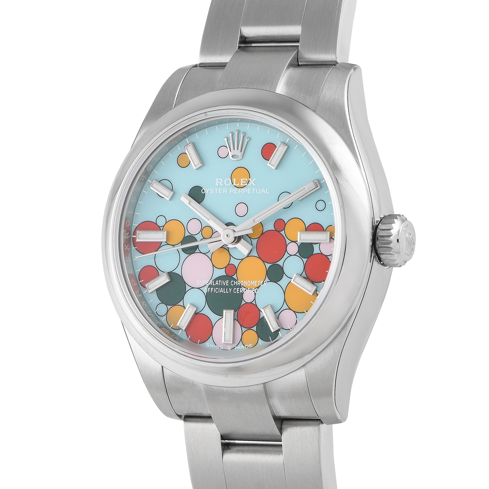 The Rolex ref.277200 is a 31mm Oyster Perpetual with a celebration dial that indeed evokes a sense of joy and fun. The watch’s face has a turquoise blue base, meticulously painted with “bubbles” in pastel pink coral, yellow, turquoise, and hunter green colors. The index hour markers and hands are filled with long-lasting blue luminescence. Inside this time-only watch is the automatic caliber 2232 that offers 55 hours of power reserve.