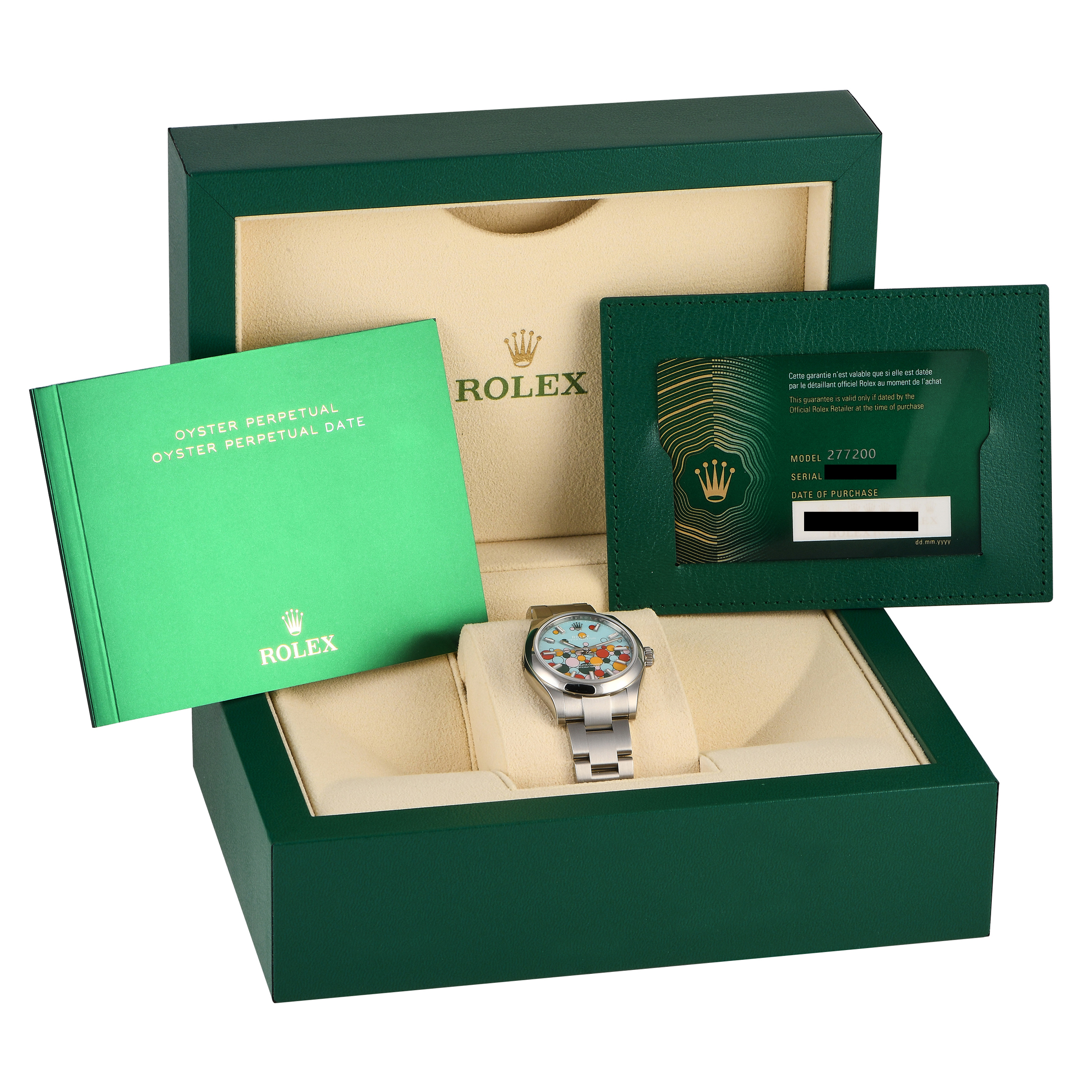 Papers and the manufacturer’s box accompany this unworn Rolex Oyster Perpetual 31 Celebration Dial Watch 277200.