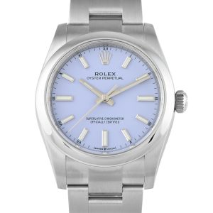 This is an unworn Rolex Oyster Perpetual 34 Lavender Dial Watch 124200. It comes complete with papers and the manufacturer’s box.