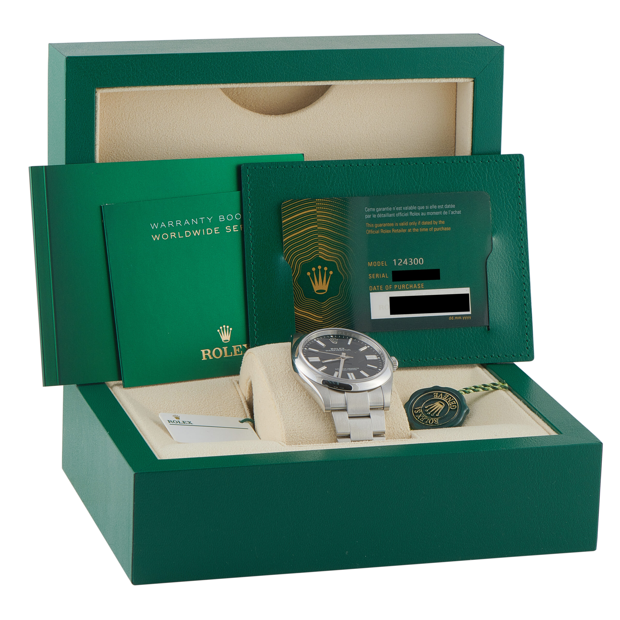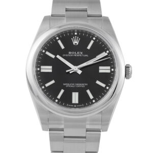 Black gives this Rolex Oyster Perpetual 36 its most direct expression. The smooth bezel and dark, clean dial keep attention on proportion and finish. Paired with the classic Oyster bracelet, the case wears with ease and balance. Power comes from caliber 3230 self-winding movement, providing modern reliability and precision. Simple by design, this entry-level Rolex is intended for regular wear, emphasizing versatility across settings.