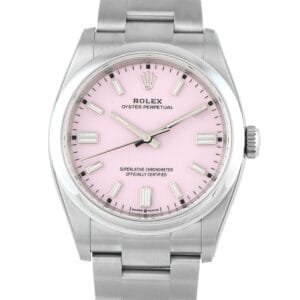 Designed for everyday comfort, this Oyster Perpetual 36 brings a cheerful splash of candy pink to your wrist. The watch features a compact 36mm Oystersteel case on a matching Oystersteel bracelet. Its candy pink dial looks bright but not overpowering, able to give the watch a contemporary look while staying rooted in Rolex’s heritage design. Driven by the automatic caliber 3230, this timepiece offers precision, durability, and a 70-hour power reserve, ensuring it keeps time through the weekend and beyond.