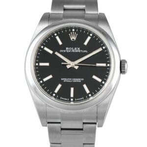 This is a pre-owned Rolex Oyster Perpetual 39 Black Dial Steel Watch 114300. It is accompanied by papers and the manufacturer’s box.