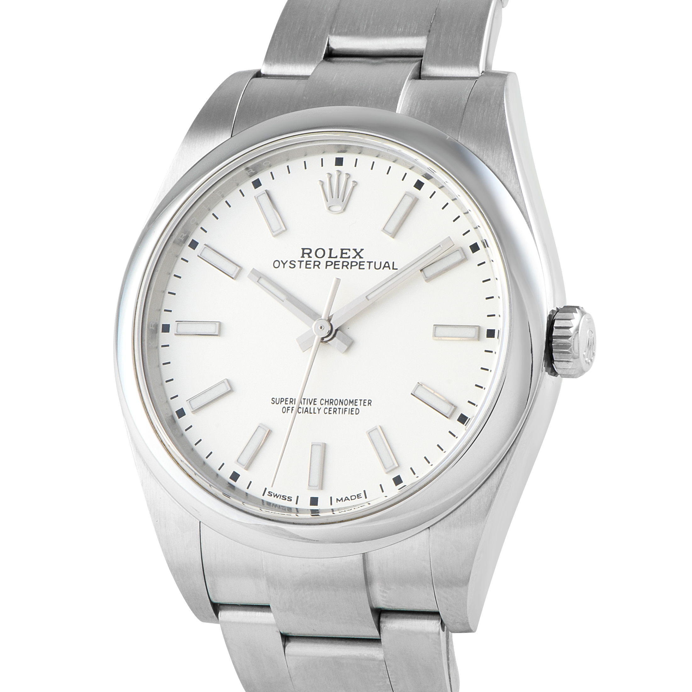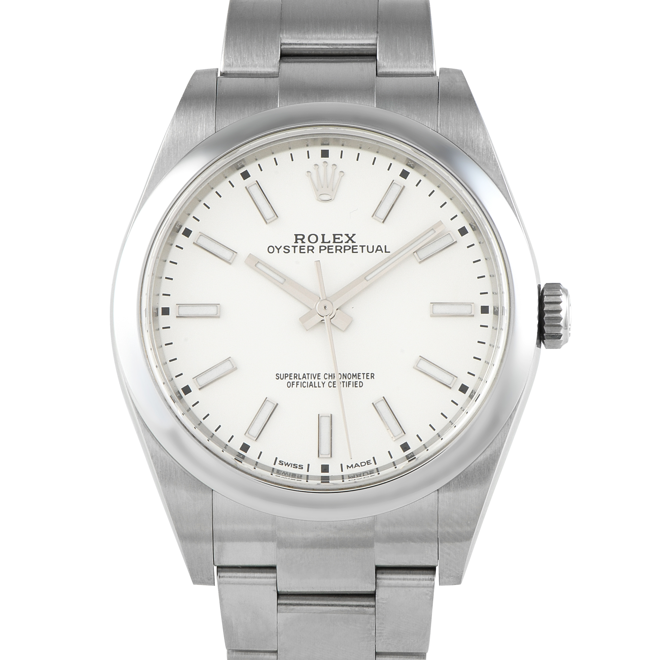 This Rolex Oyster Perpetual 39 White Dial Watch 114300 comes with papers and a gift box.