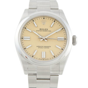 This is a pre-owned Rolex Oyster Perpetual 41 Beige Dial Oystersteel Watch 134300. It is accompanied by papers and the manufacturer’s box.