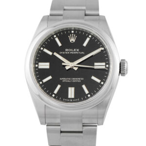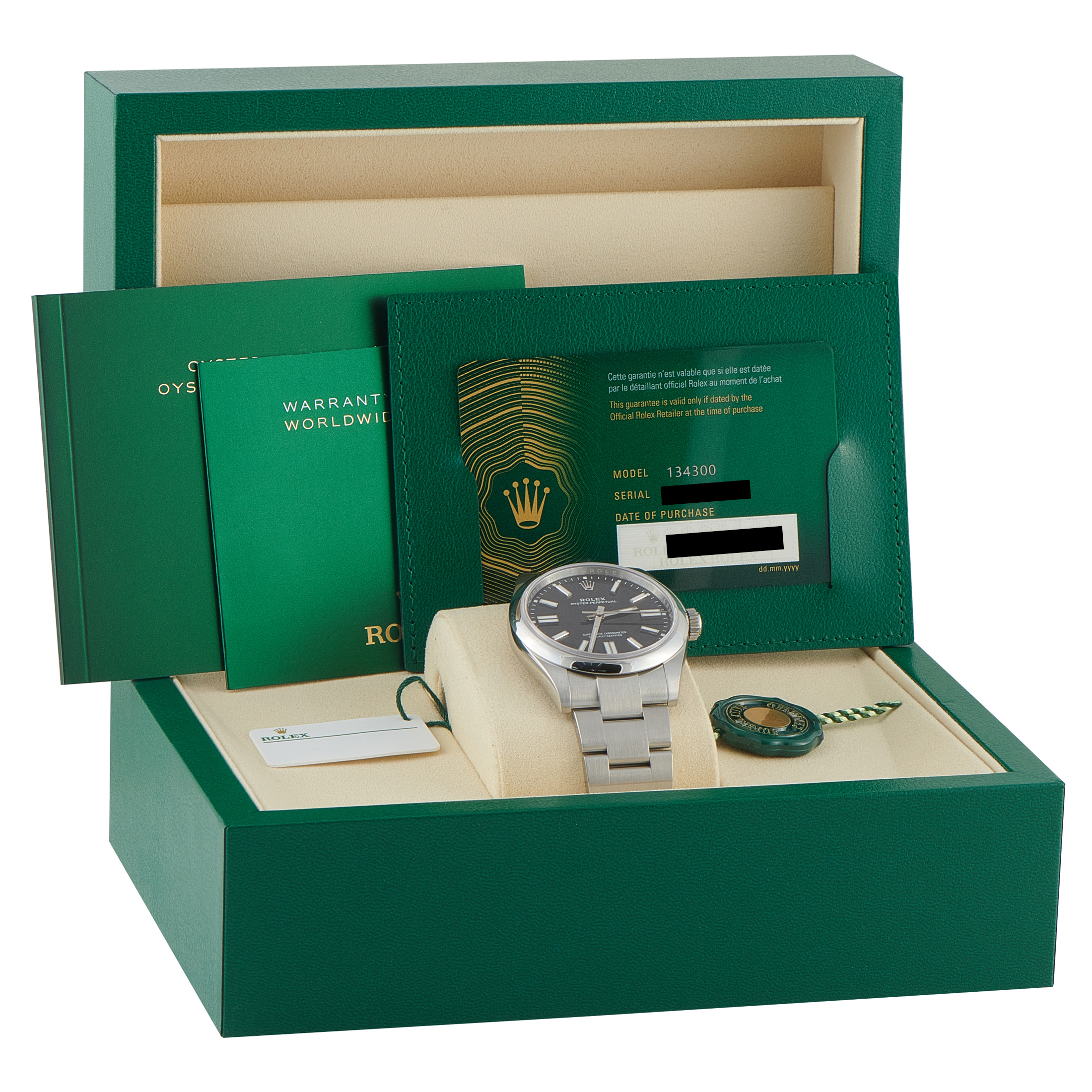 This is an unworn Rolex Oyster Perpetual Black Dial Oystersteel Watch 134300. It comes complete with papers and the manufacturer’s box.