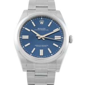 This pre-owned Rolex Oyster Perpetual 41 Blue Dial Oystersteel Watch 124300 includes the manufacturer’s box and papers.