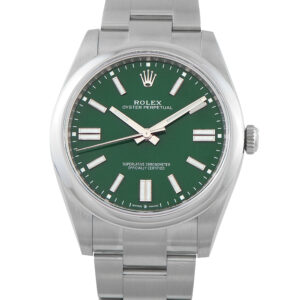 Offered pre-owned, this Rolex Oyster Perpetual 41 Green Dial Steel Watch 124300 comes with papers and the manufacturer’s box.