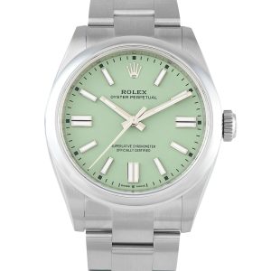 This is an unworn Rolex Oyster Perpetual 41 Pistachio Dial Oystersteel Watch 134300-0006. It comes complete with papers and the manufacturer’s box.