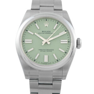 This pre-owned Rolex Oyster Perpetual 41 Pistachio Dial Oystersteel Watch 134300 includes papers and a gift box.