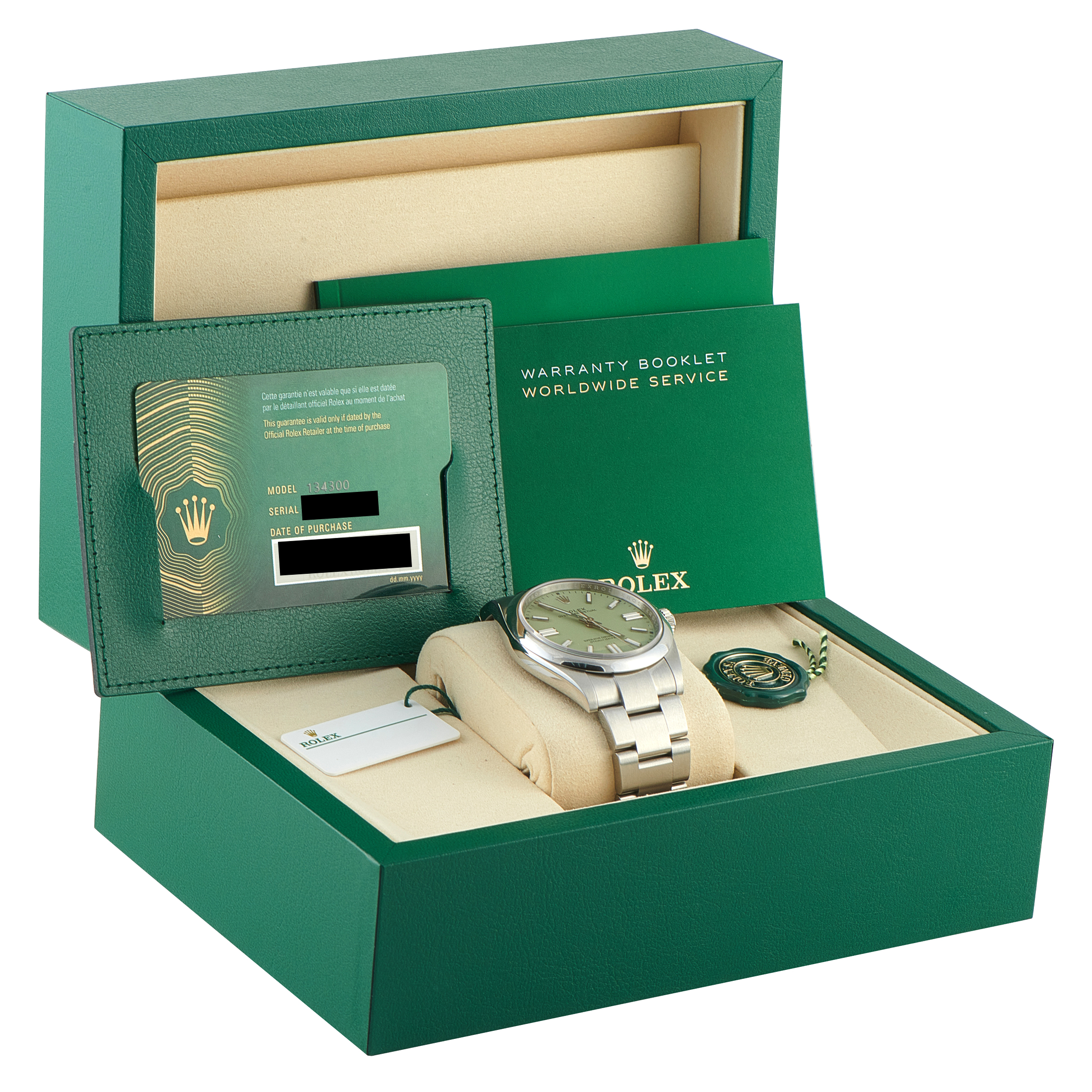 Papers and the manufacturer’s box accompany this unworn Rolex Oyster Perpetual Pistachio Dial Oystersteel Watch 134300.