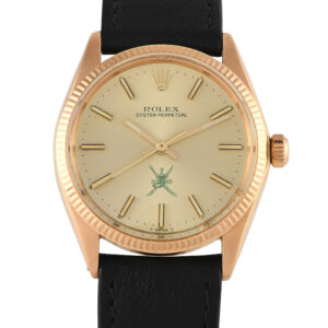 From the 1970s, here is a 34mm Rolex Oyster Perpetual beaming with vintage elegance. The case is made out of 18K rose gold and fitted with a black leather strap. The champagne dial has applied baton hour markers and tritium-lumed hands protected by acrylic glass. Also on the dial is a green Khanjar emblem indicating that this piece was a direct commission from the Sultan of Oman, His Majesty Sultan Qaboos bin Said al Said. This collectible time-only Rolex houses caliber 1570 automatic movement beating at 19,800vph.